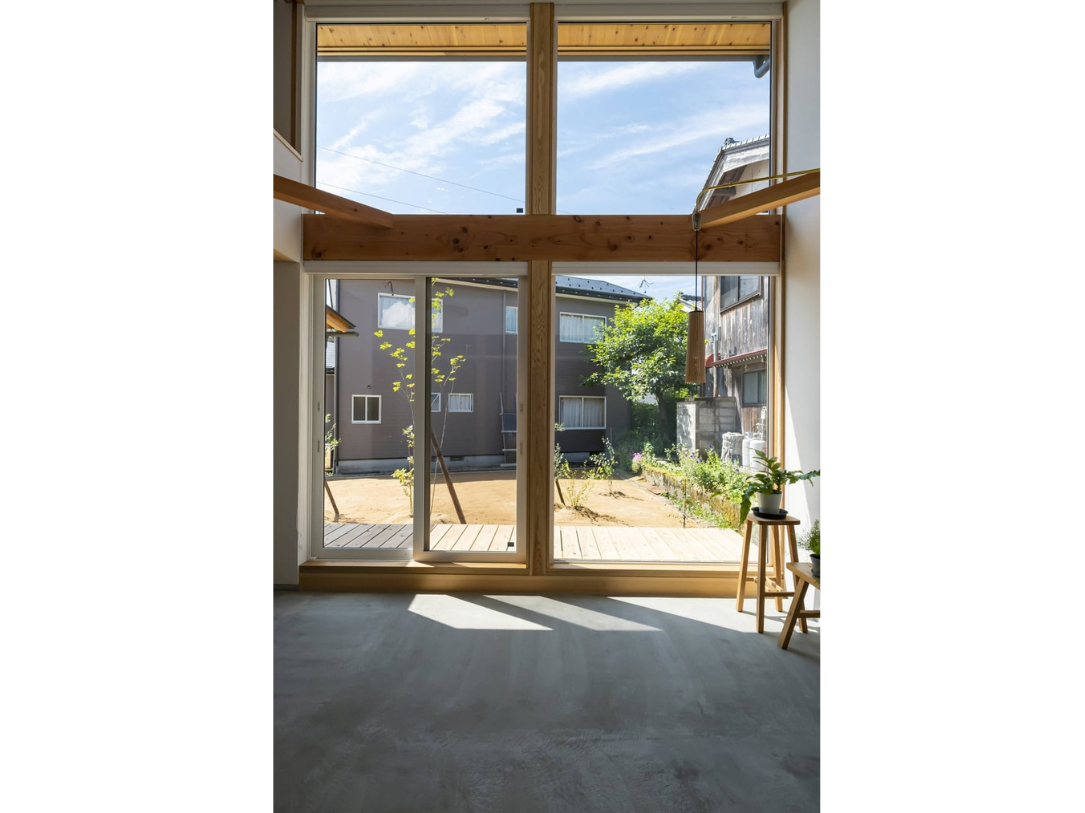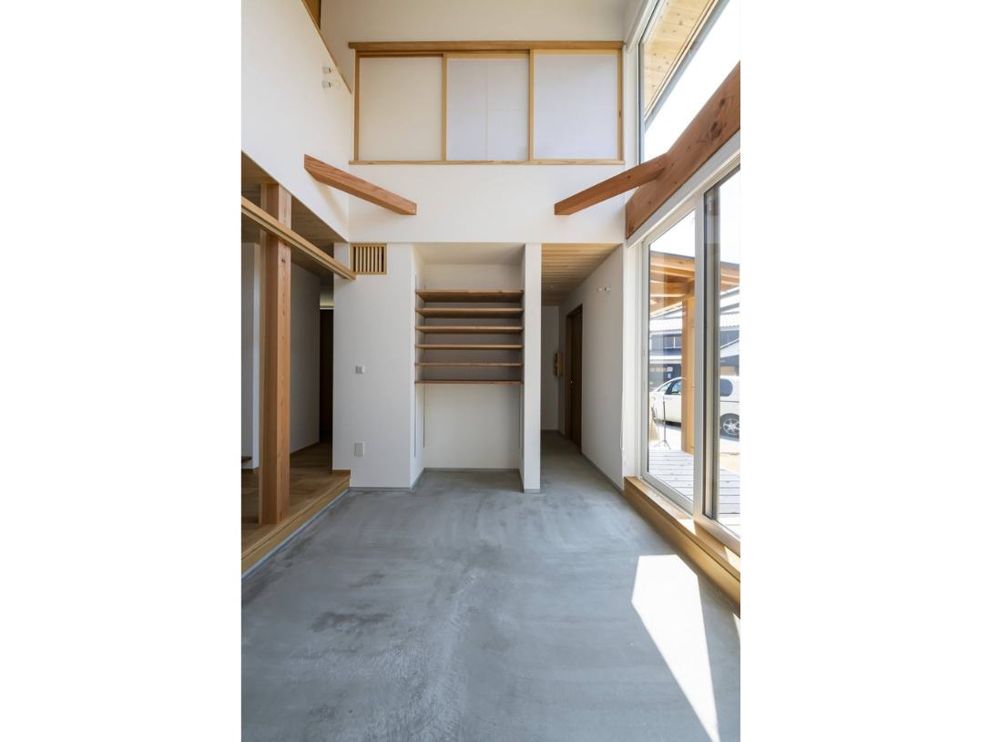 土間といえば寒いイメージもありますが、この住まいでは性能面にも徹底的に配慮しました。リビングと同じくらいの快適さを実現するために、壁の内外両方に断熱材を施した「付加断熱」を採用しています。更に大開口からたっぷり日光を取り込み、床下エアコン暖房との併用で温かく過ごせます。夏の暑さには日差しを約9割カットしてくれる遮熱シェードを採用するなどで対応。素材選びやデザイン性だけでなく、「使い勝手」「温熱環境」「日射のコントロール」などで、長く心地よく暮らす工夫を施しました。