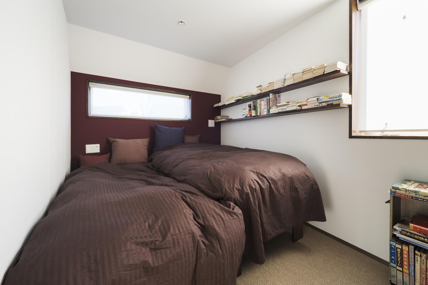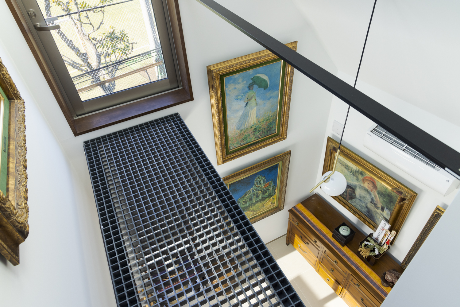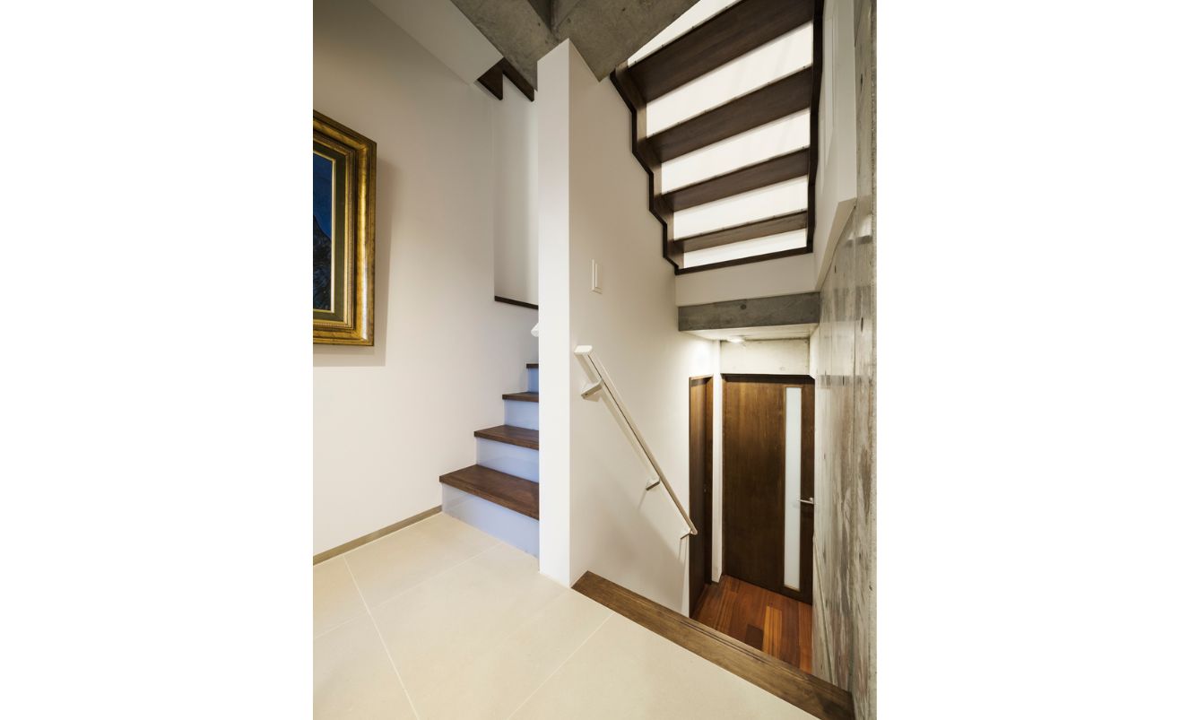 周囲の視線や音から守られたプライバシーを確保しながら、家族全員が自由に、そして安心して過ごせる空間が広がっています。1階には音を遮るためコンクリートを使用し、2階のLDKにはバルコニーを設けて隣家との距離を保ちながら、視線を遮る高い柵で守られた外を感じられるプライベート空間が実現。コンパクトな敷地でも高さを活かして、各空間をスキップフロアのように緩い階段で繋ぐことで広がりをもたらします。またそうすることで、住み手の希望する部屋数を叶えました。