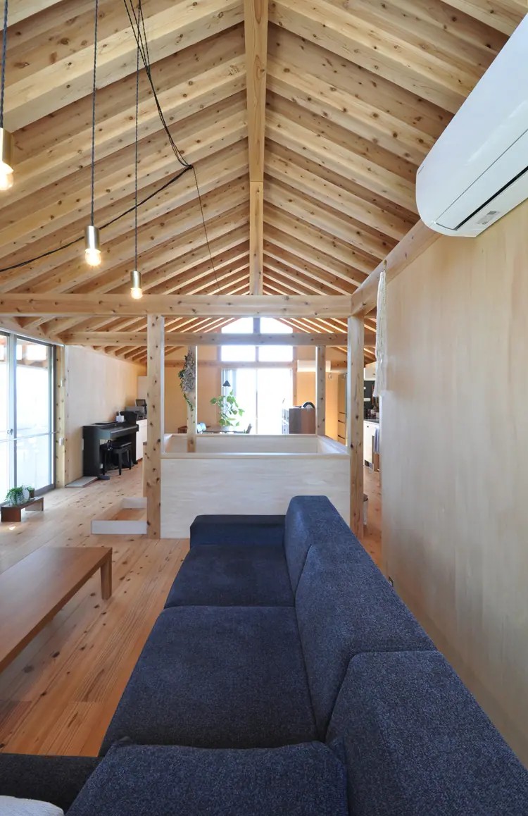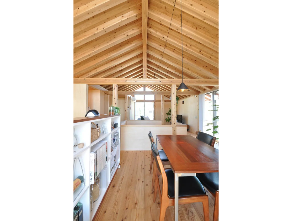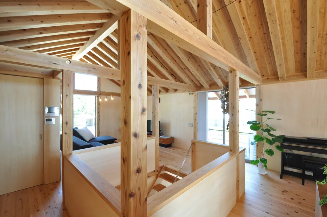 その工夫のひとつが、1階の天井と2階の床を兼ねた“踏天井”の採用です。36ミリ厚の無垢杉材を1枚貼るだけで床と天井の両方を構成。コストを削減しながらも、杉の柔らかな踏み心地と、見上げたときの温かみのある表情が、居心地のよさをつくります。