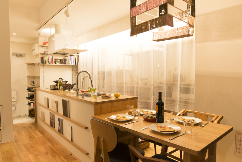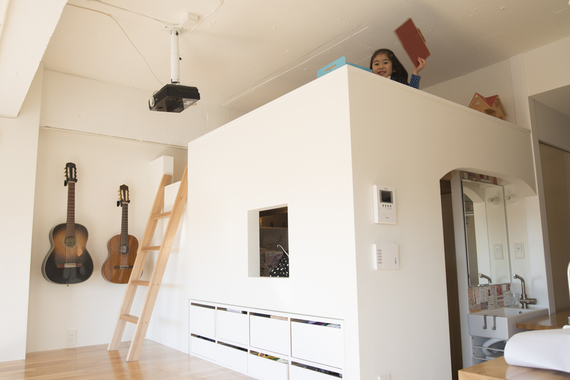 たとえば、廊下は通路でありながら、子どもがキッチンの向かいに立ってお手伝いできるスペースや洗面所を兼ねています。和室だった部屋はベッドが収納できる小上がりに変更することで、昼はリビングに、夜は寝室として使えます。座卓と同じ高さで製作しているので、大人数で囲むダイニングとして使えたり、窓にスクリーンを張ってベッドを引き出し映画館のように過ごせたりと、楽しみ方は様々です。