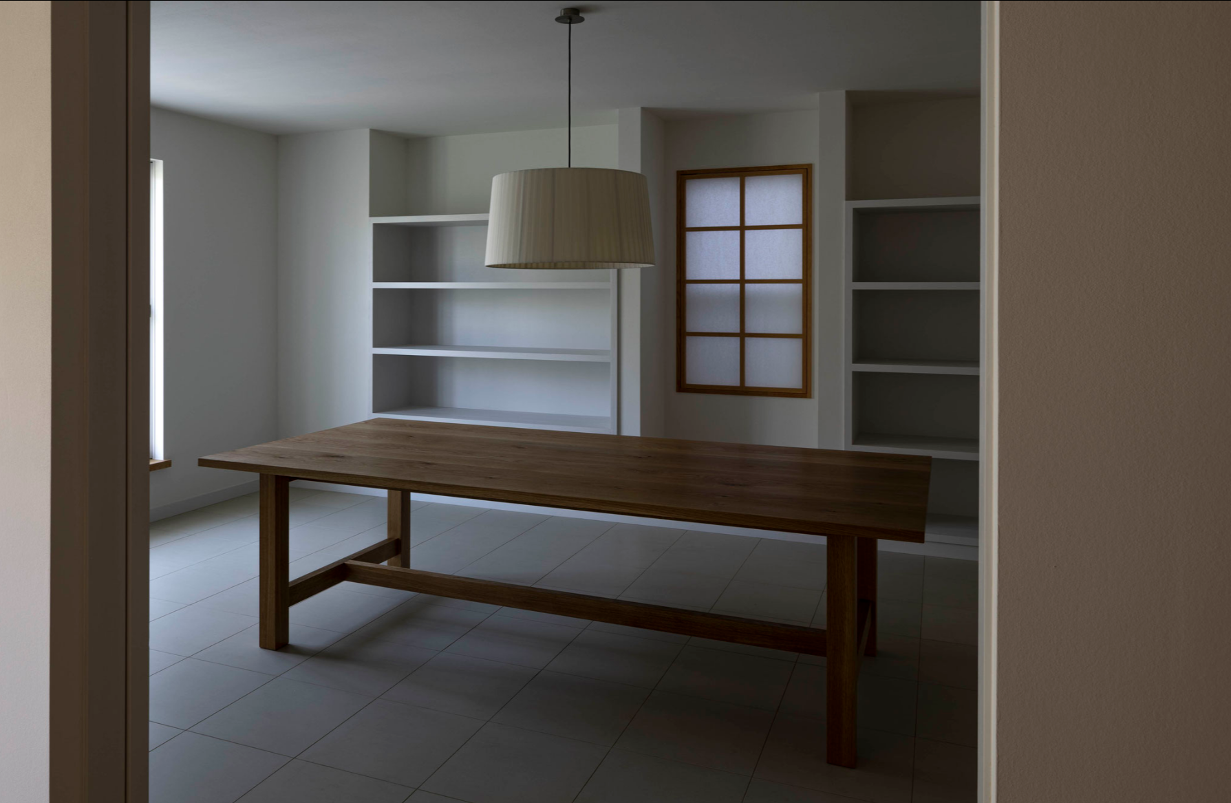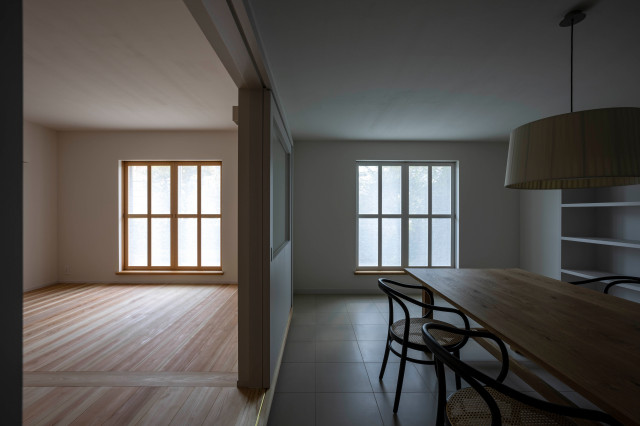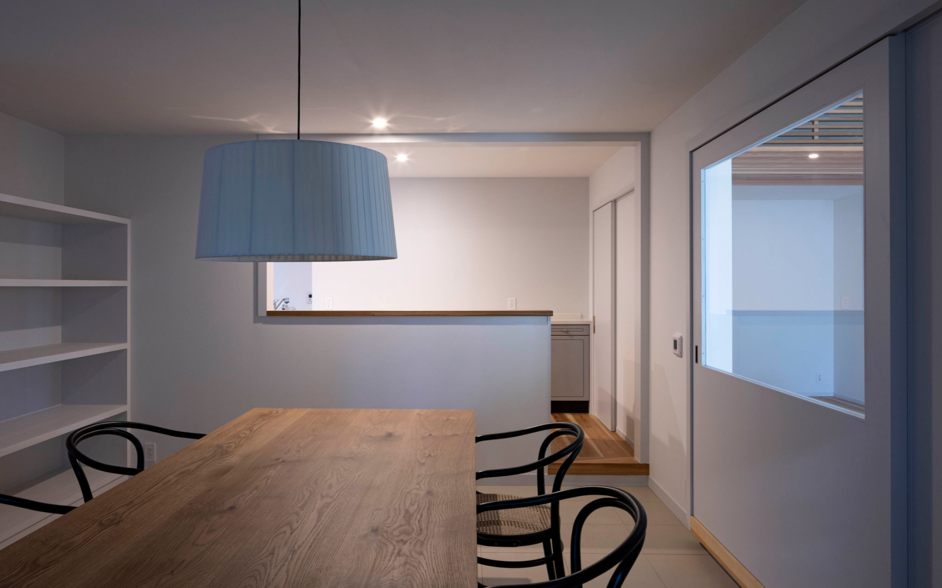 また、食堂の床は一段掘り下げてタイル張りにすることで、多目的に使えるようなデザインとしました。二世帯住宅ということもあり、親族が集まる場として、パブリックな使い方もできるように設計しています。床暖房も備えているため、冬場も快適に過ごせます。