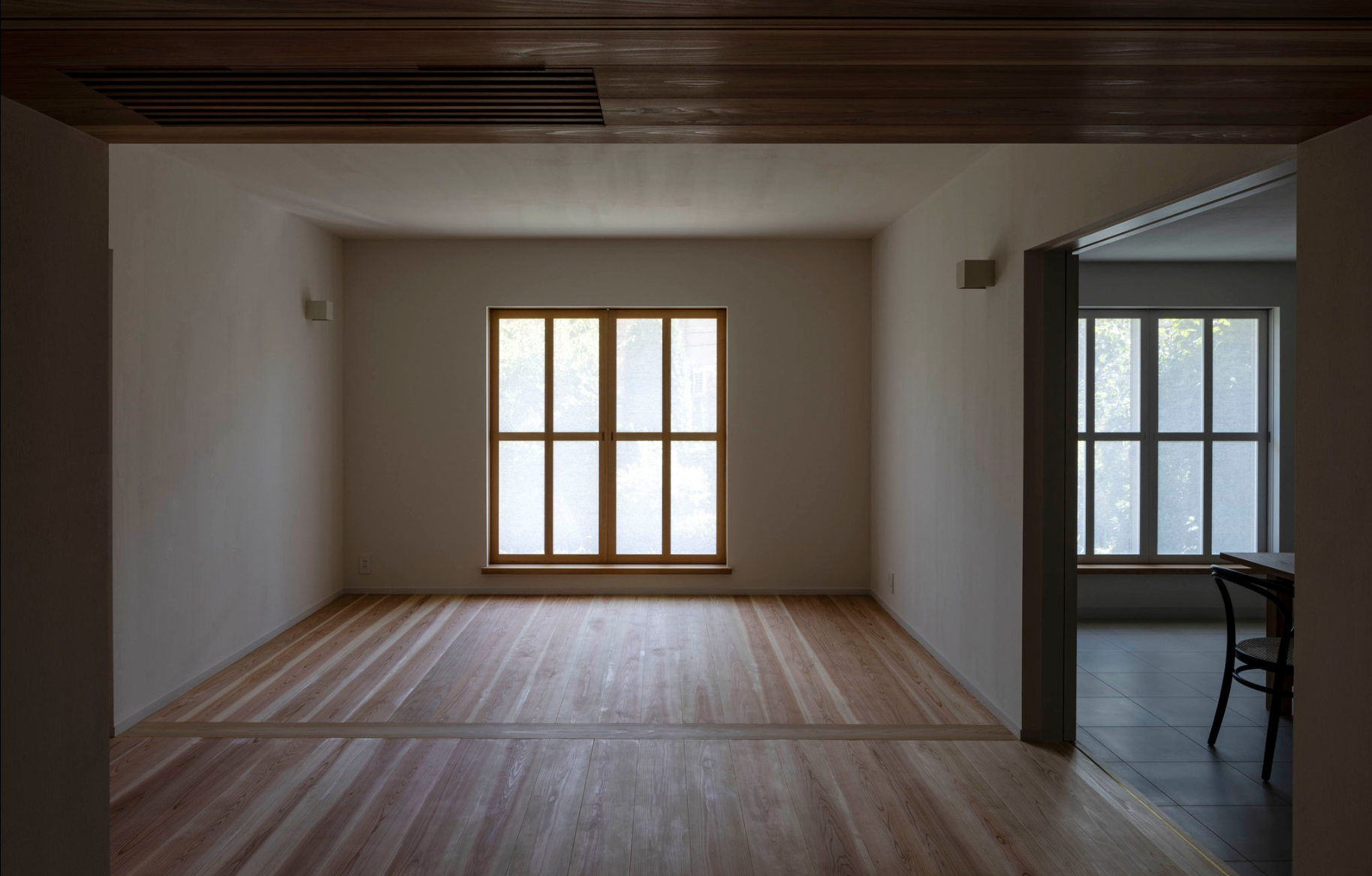 網戸の代わりに採用した、折り込んだ和紙を張った「障子網戸」からは、柔らかな質感の光と適度な風が感じられます。通常はサッシの外側に設置する板戸を、今回はあえて内側に設置することで、レース状の網戸障子と板戸を組み合わせ、光の調整やプライバシーの確保を可能にしました。