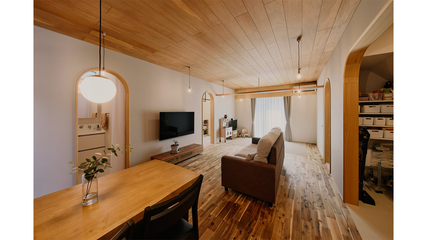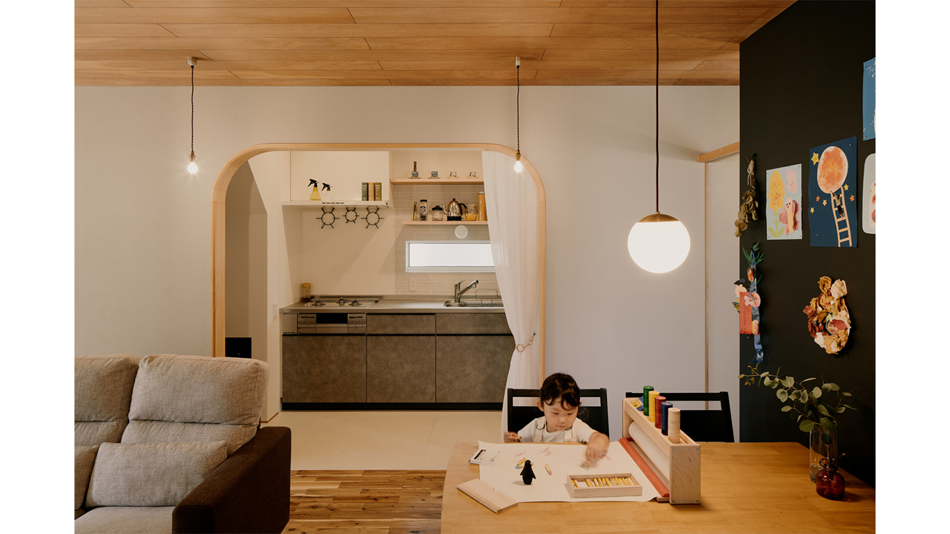 中心のリビング・ダイニングは、キッチン棟・水廻り棟、そして上階に包まれ、いわば守られるようにしてつくられた“穏やかな場所”。床や天井の目地が視線を導き、素材の切り替えやアーチの先に見える明るいトーンが、空間に奥行きと広がりをもたらす。玄関へと続く左右の小さな抜けも、空間を視覚的に開放する“余白”として機能する。靴棚は裏側から見るとリビングの象徴的な黒板となり、機能と表情を併せ持つ構成だ。そっとはりめぐらされた“さりげない”設計の妙が息づく。