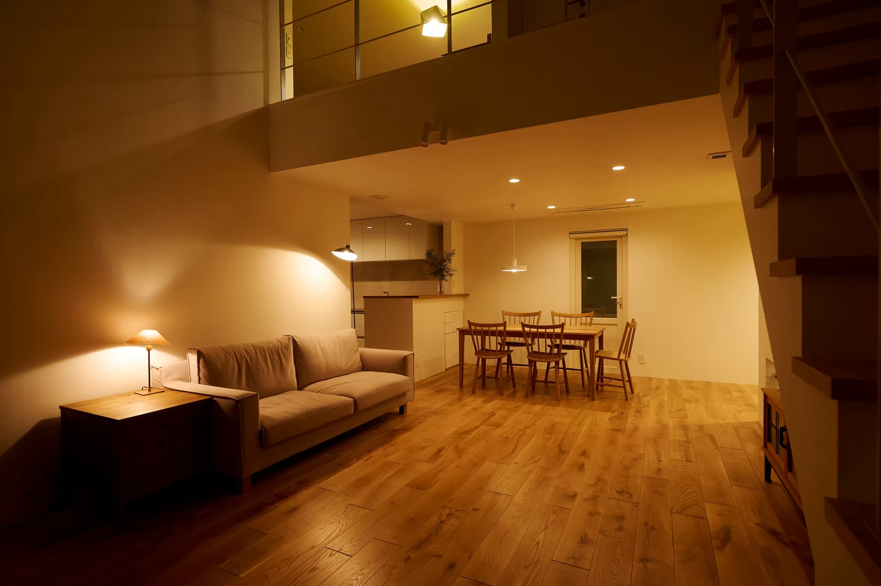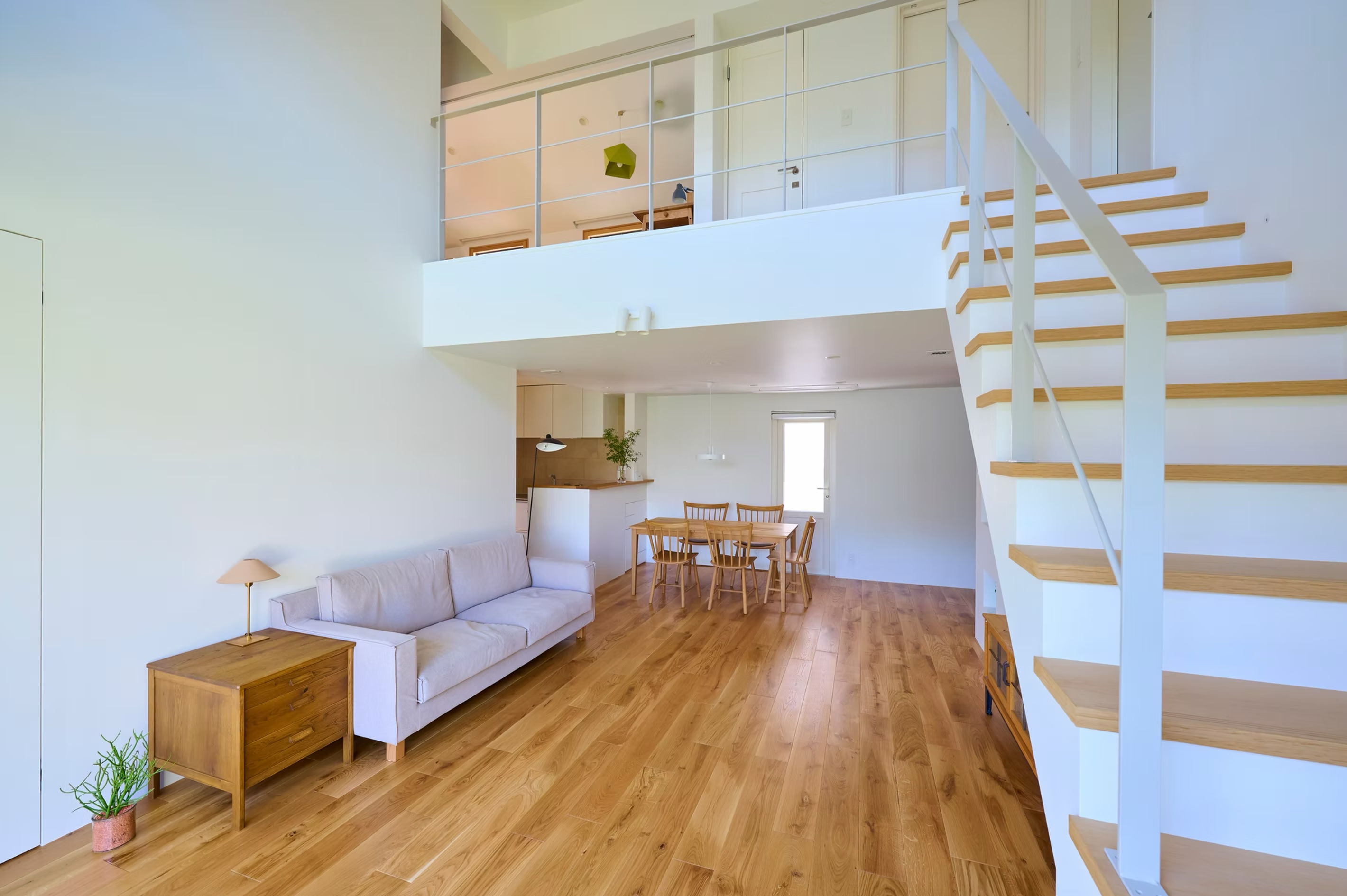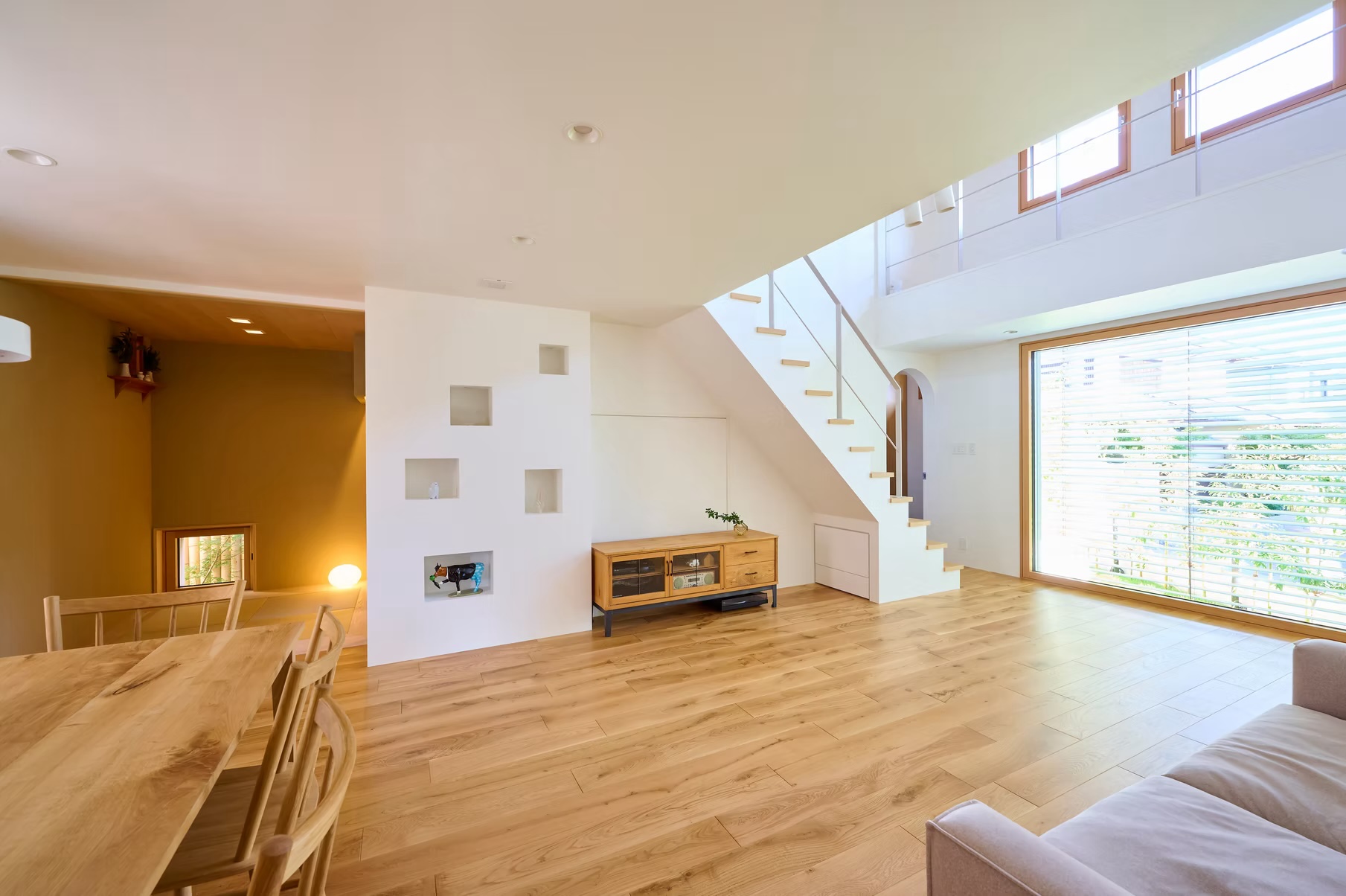 床には無垢材を使用し、自然素材ならではの温もりと質感を感じられる空間に。LDKには大きな吹き抜けを設け、開放感とともに、家全体に空気が循環する設計となっています。