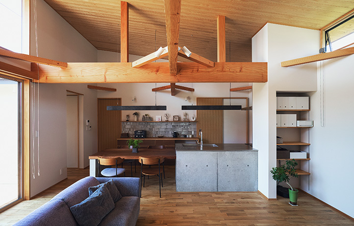 また、LDKのキッチンには、住まい手の要望に応じてコンクリートを基調としたデザインが施されています。コンクリートの脚に木をはめ込んだ造作キッチンが、木を基調にした温かなLDKの中でアクセントとなり、シンプルでありながら個性的な雰囲気を作り出しています。