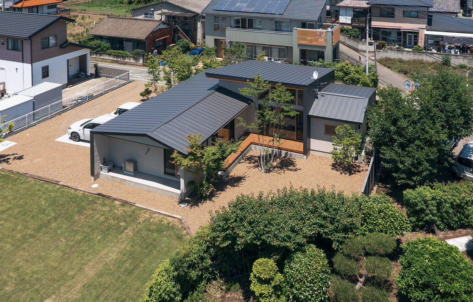 隣家の生垣を活用し、中庭を囲むようにL字型に配置されたこの住まいは、プライバシーを保ちながら開放感も大切にしています。広がりのあるLDKは、内と外が調和した空間で、どこからでも中庭の景色を楽しむことができます。住まい全体がゆったりとした時間の流れを感じさせ、LDKを中心に生活が広がります。