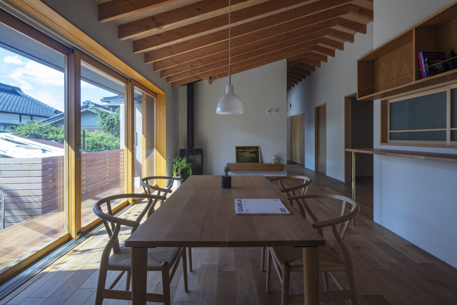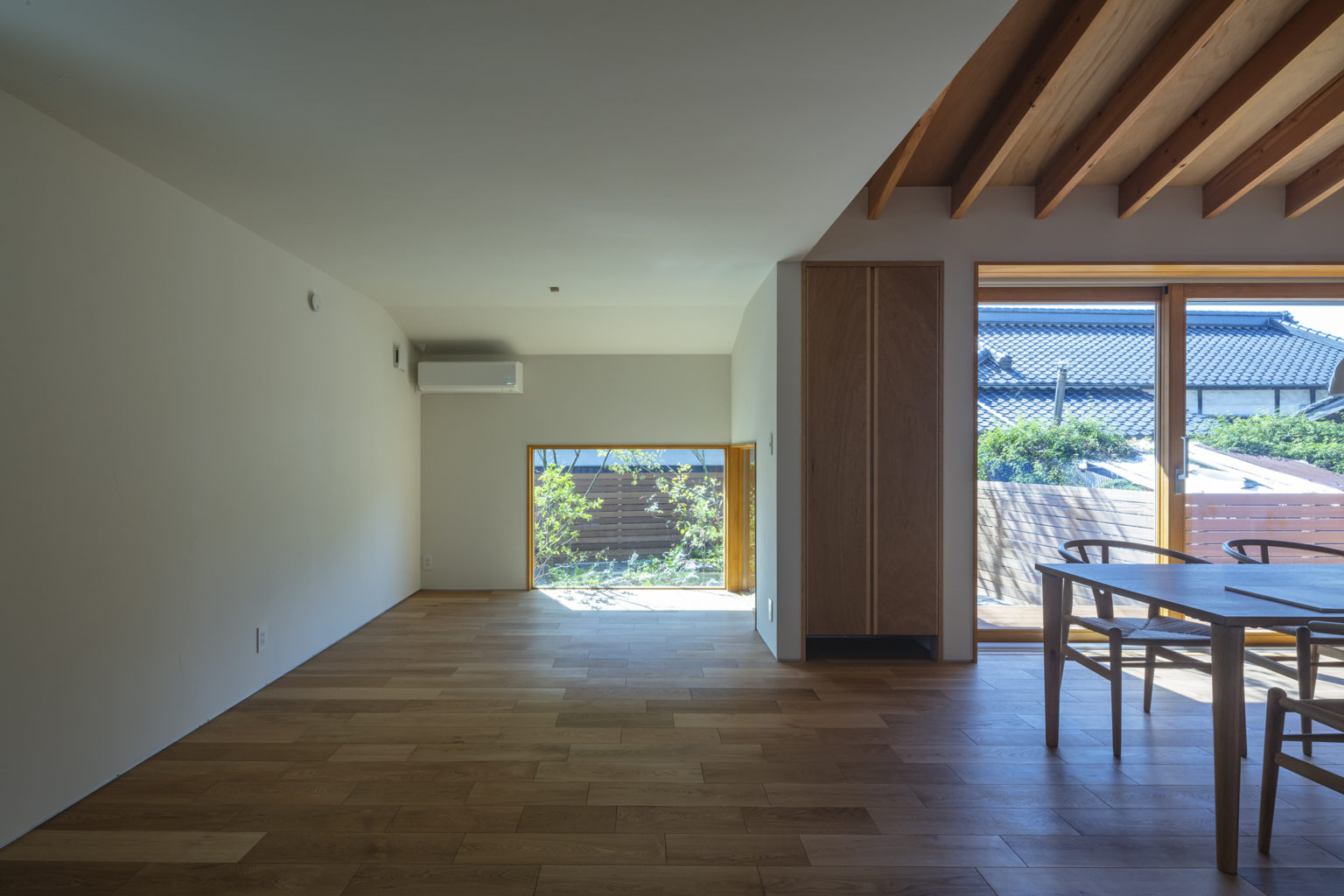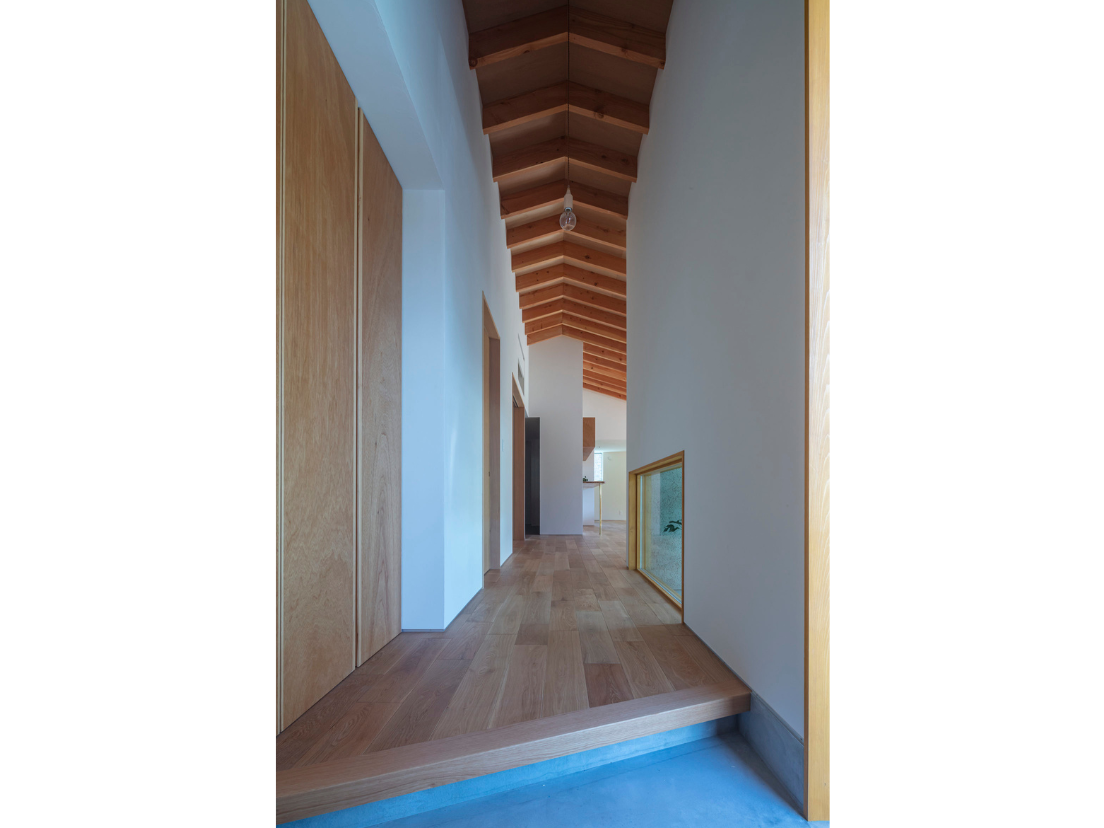 玄関から住まいの奥まで続く勾配の屋根は梁をあらわしにしたことで、すべてがひとつの空間のようにつながり、開放的な印象となります。
