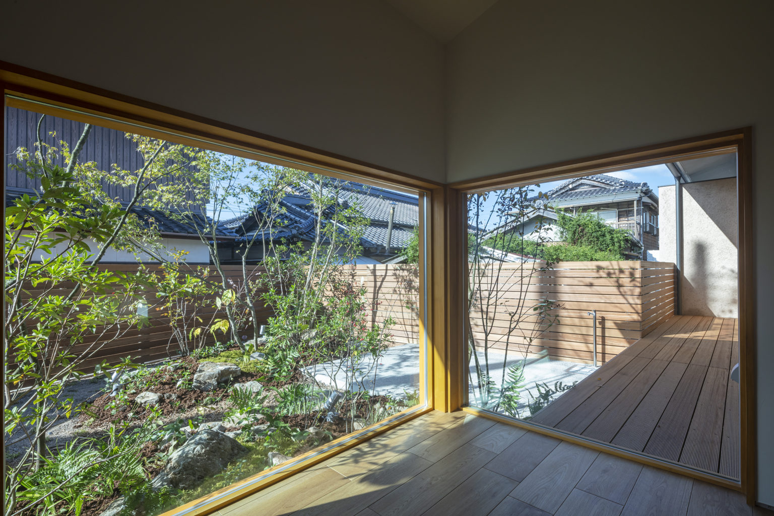 廊下には、低い位置からも植栽が見える地窓を設けたことで、日常の中に変化や新しい発見が感じられます。