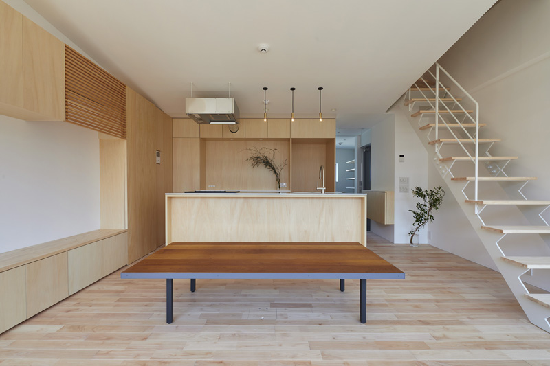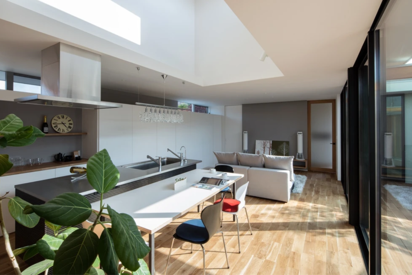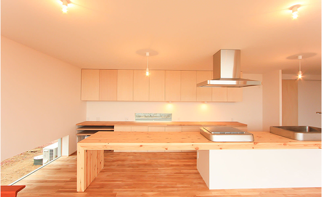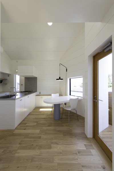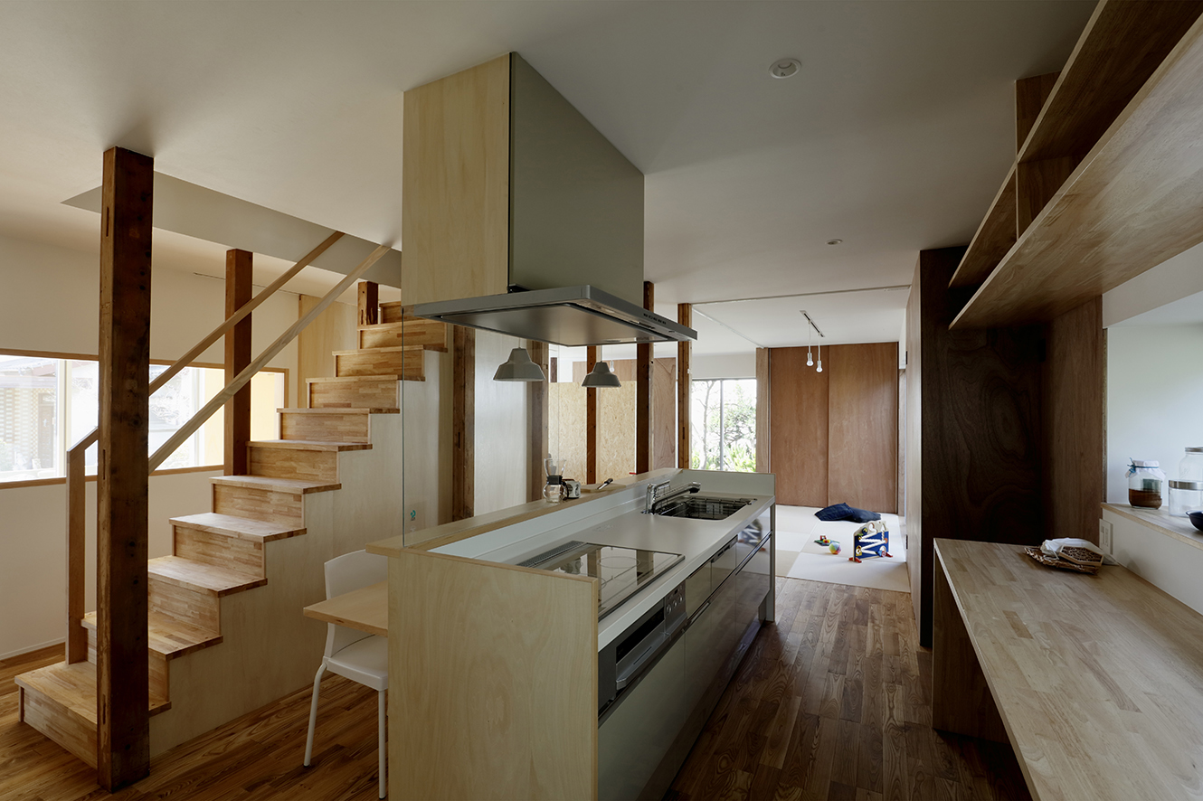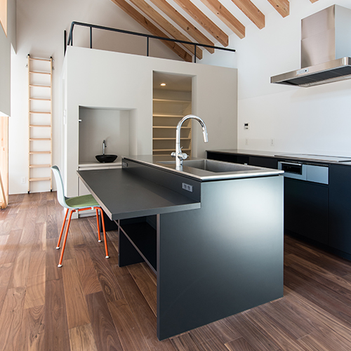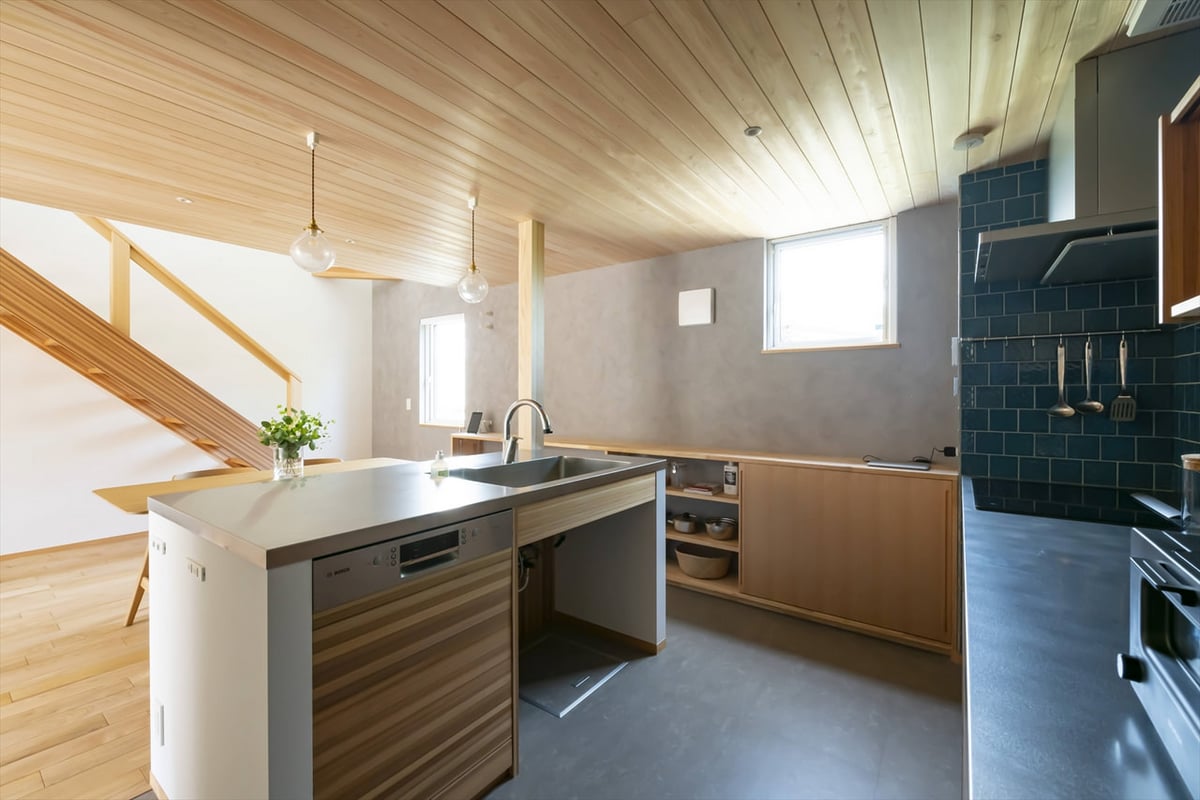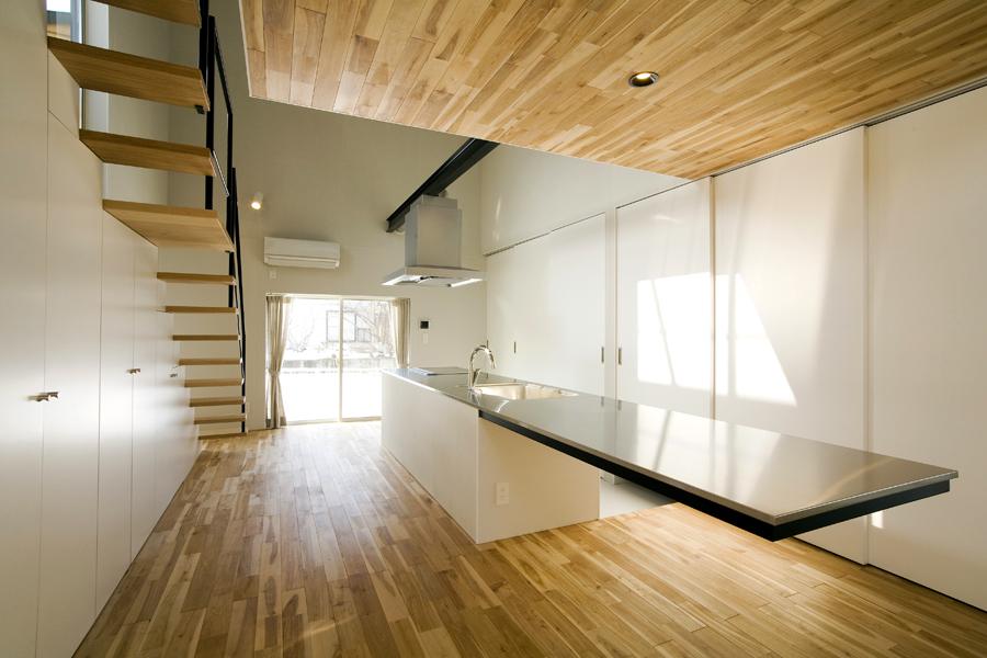 天井はキッチンからリビングの開口に向かって高くしていくことで、空間を広く感じさせるとともに、低い重心から開口部上方へと視界が広がってゆく構成になっています。