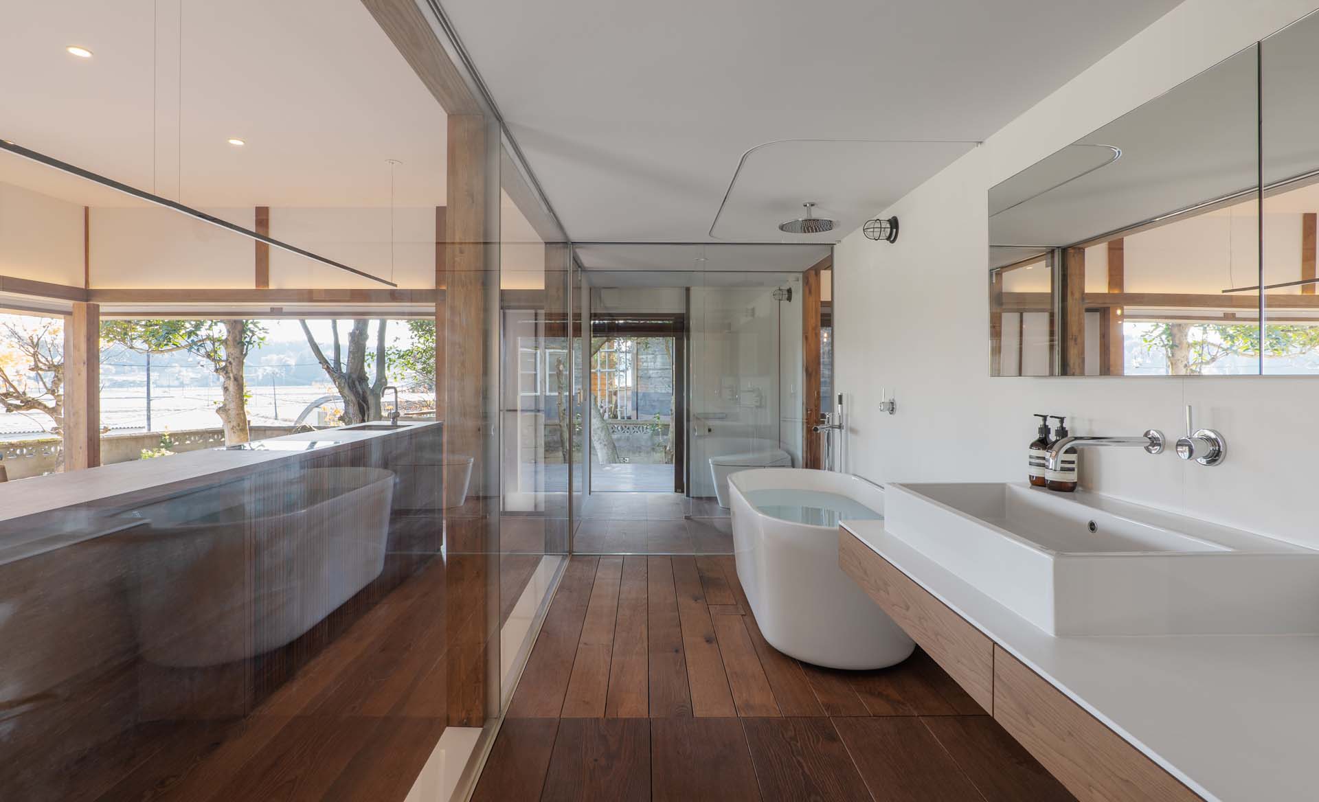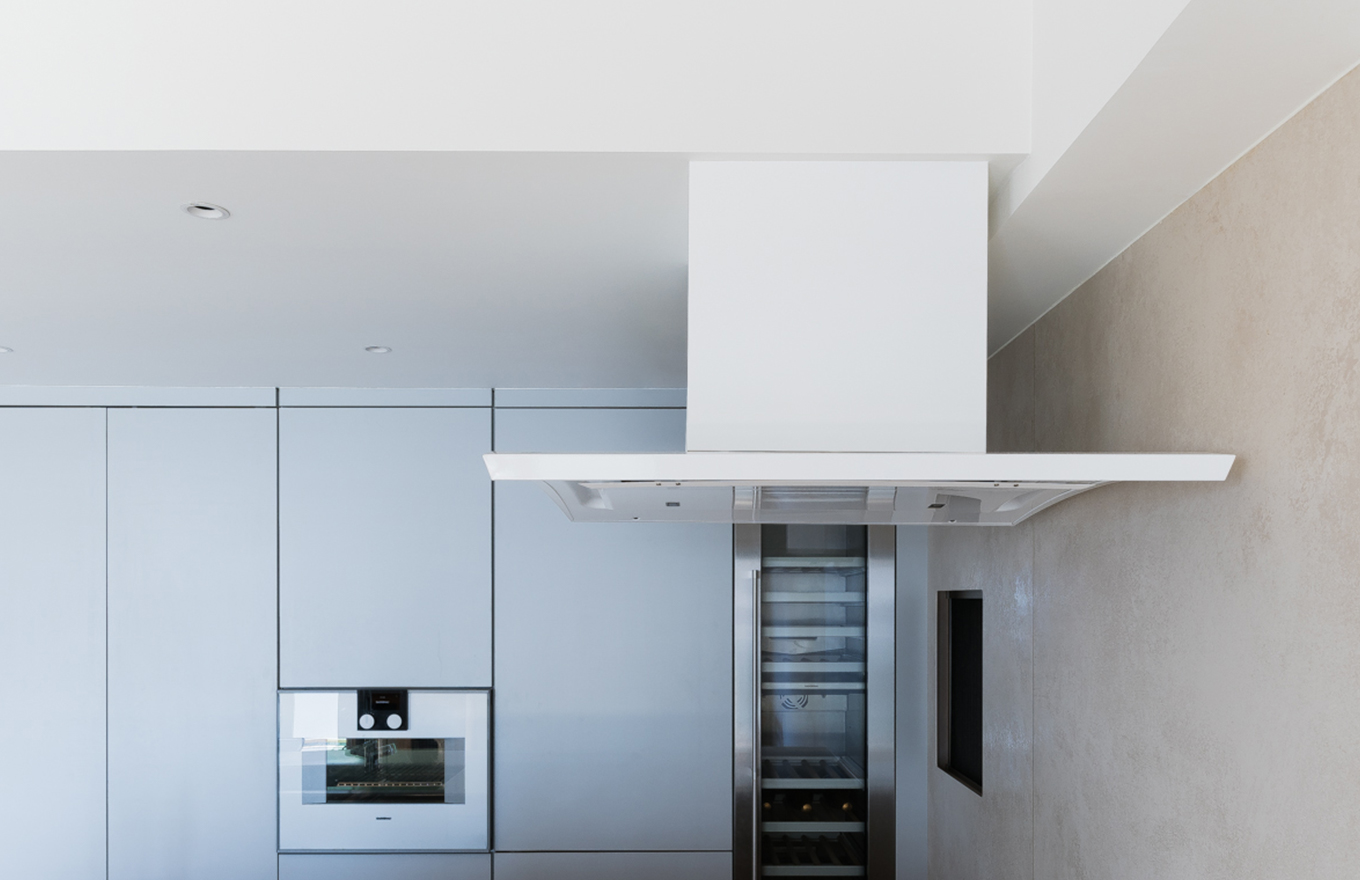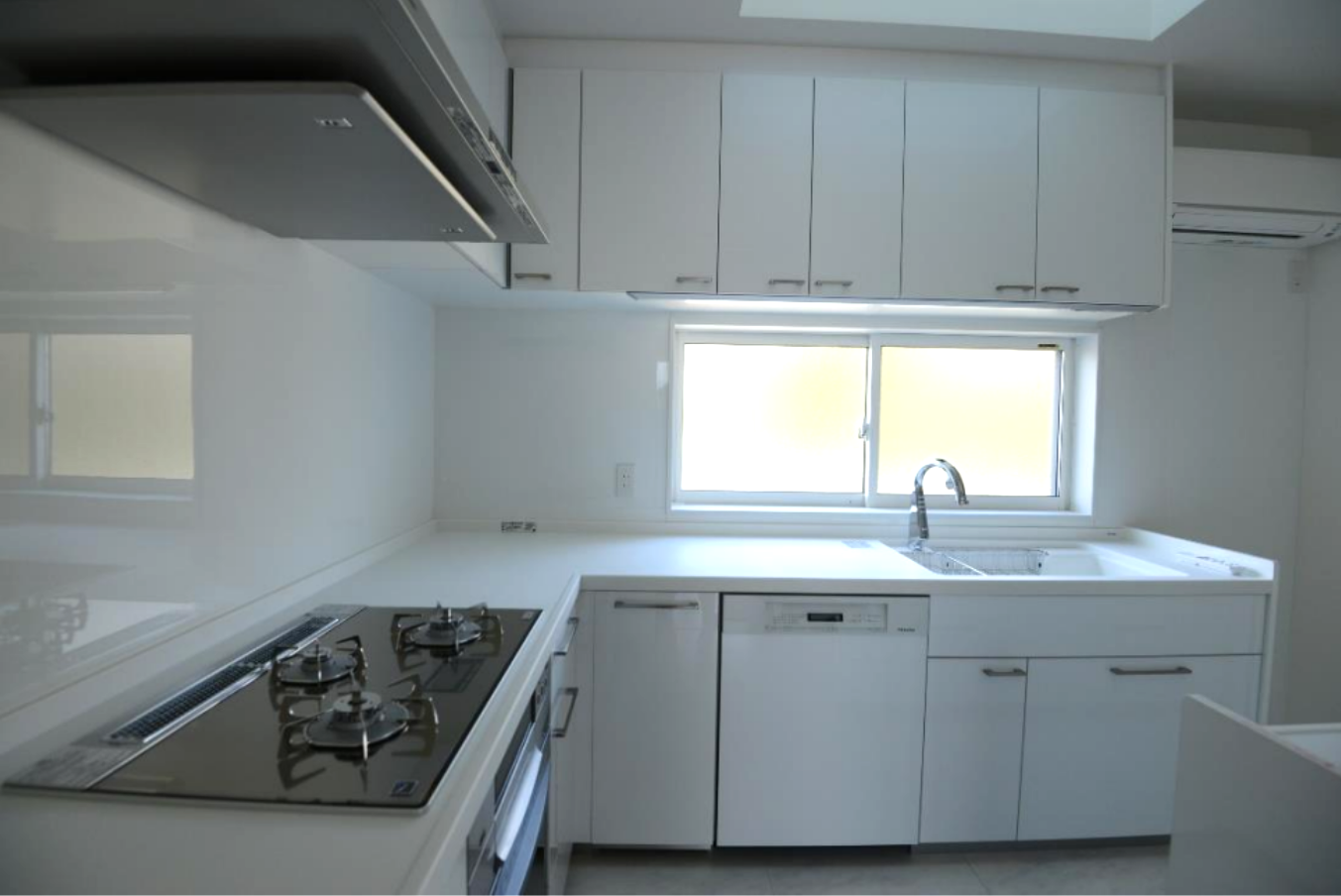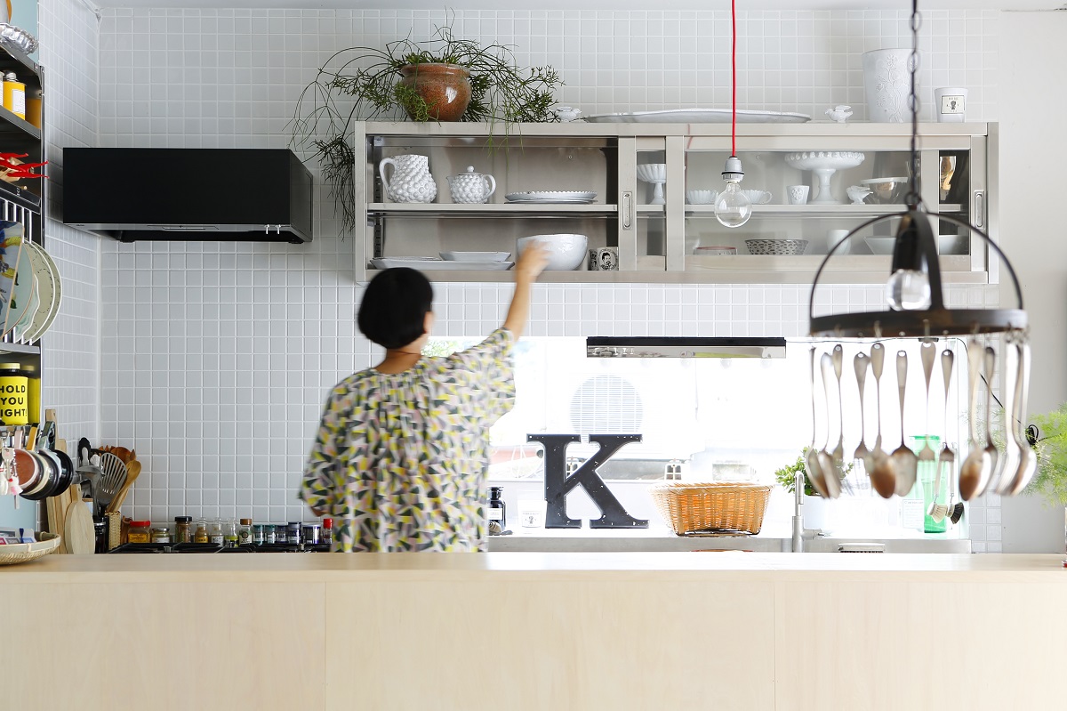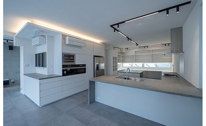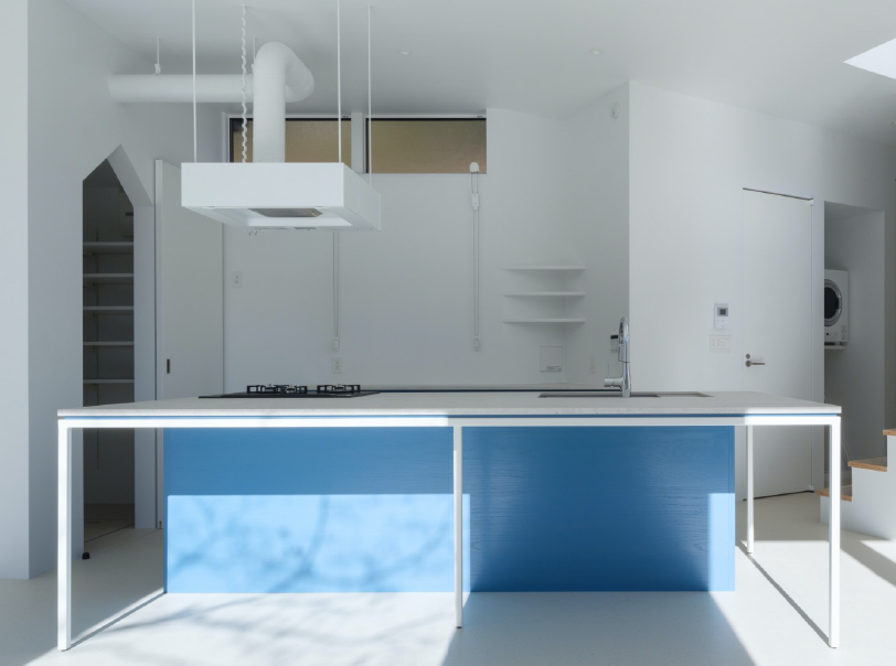 天井はキッチンからリビングの開口に向かって高くしていくことで、空間を広く感じさせるとともに、低い重心から開口部上方へと視界が広がってゆく構成になっています。
