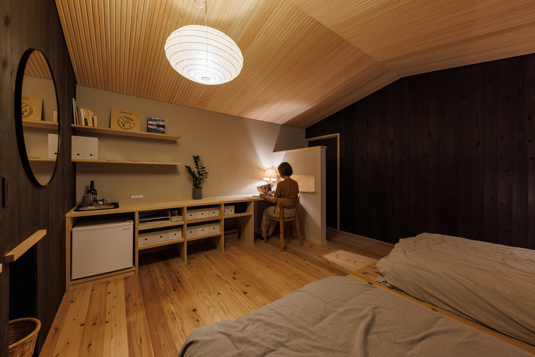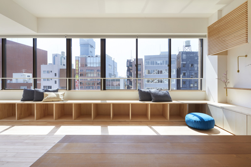 ちゃぶ台を囲むように、低い収納やまちを眺めることができる窓辺のベンチを配置し、床に座った時にもすぐ手の届く所に収納があり、かつそれらが背もたれにもなるようにしました。