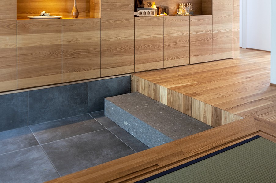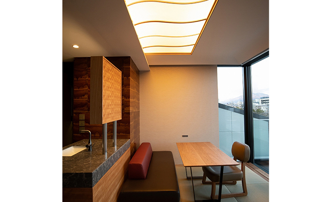 そこで、床に座って生活する「床座」の生活を基本に据え、家具などの設えも重心を低く設定したリビングルームを提案しました。