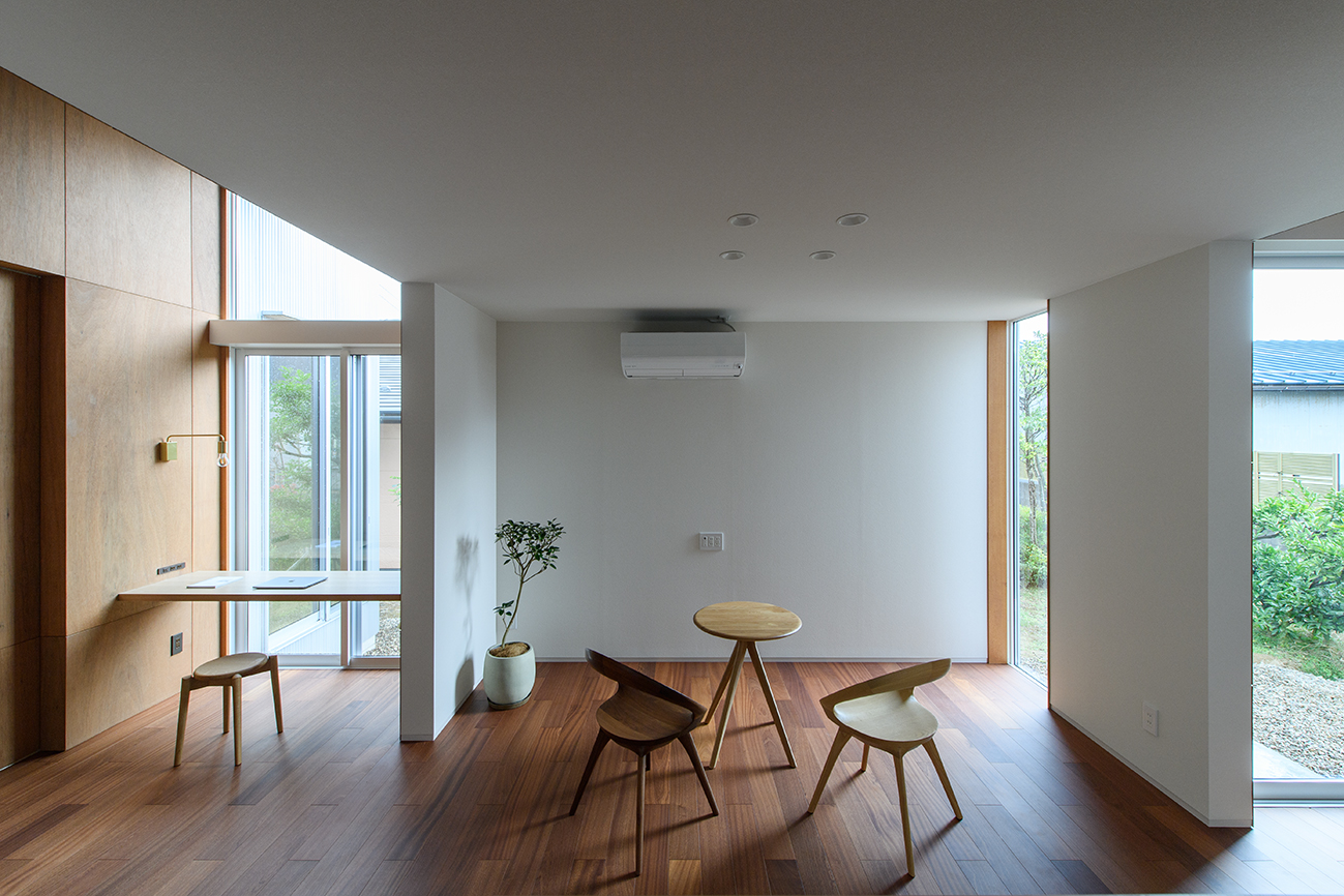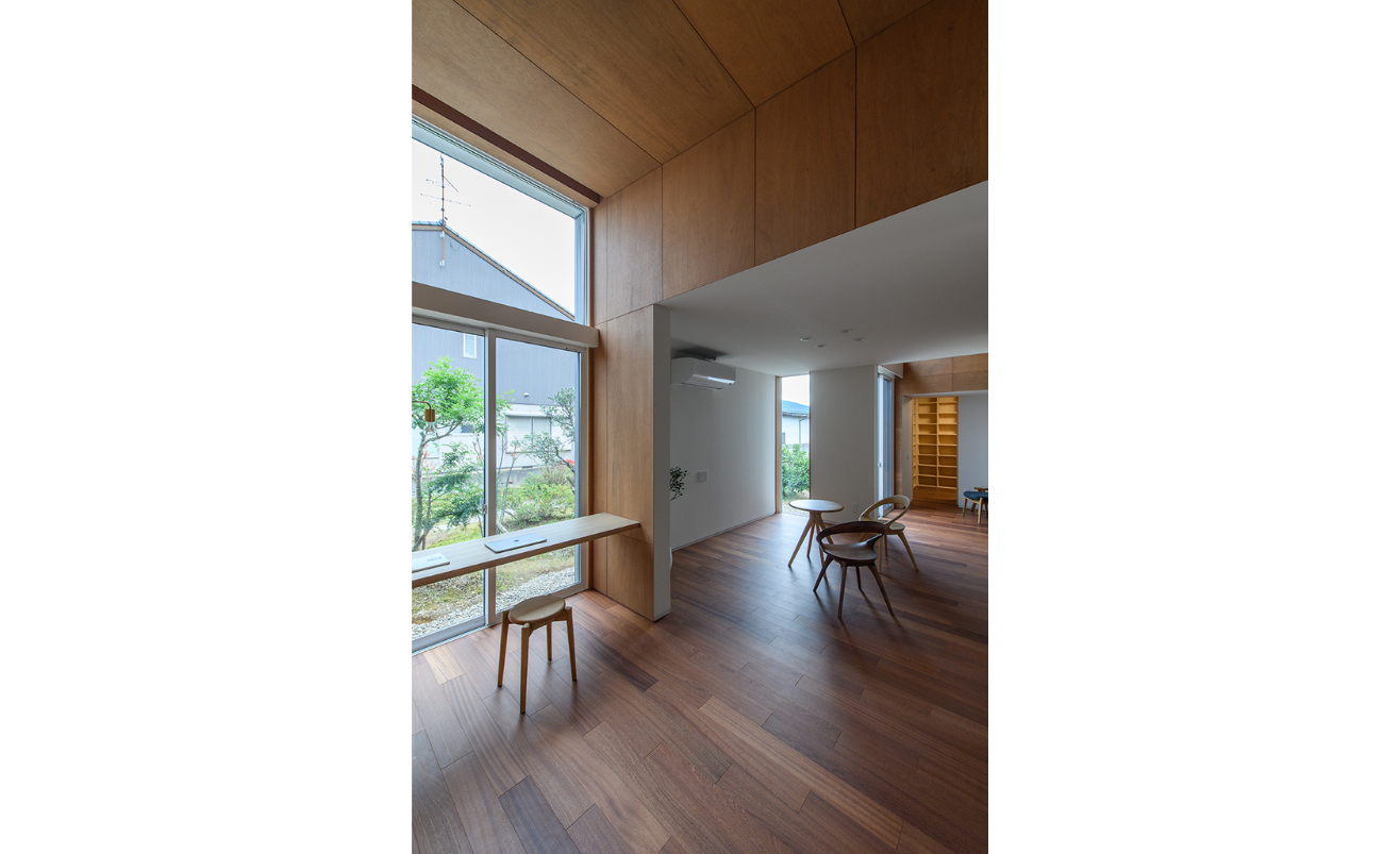 隣接する実家の庭を暮らしに取り込むため、既存の樹木の配置に合わせて大きな窓を分散配置し、自然を感じられる開放的な空間をつくりました。天井が高く光が差し込む場所と、天井高さを抑えた落ち着いた空間が、ひとつながりのワンルームとしてゆるやかに共存。過ごす時間に合わせて場所を選べる、自由度の高い空間構成に。