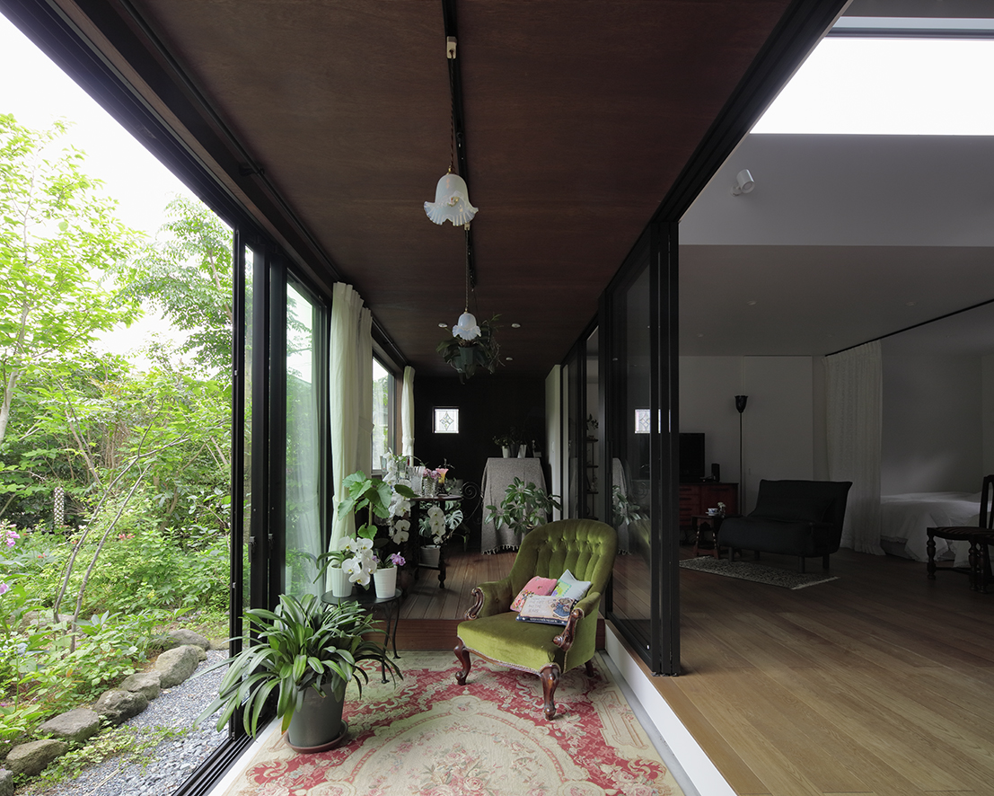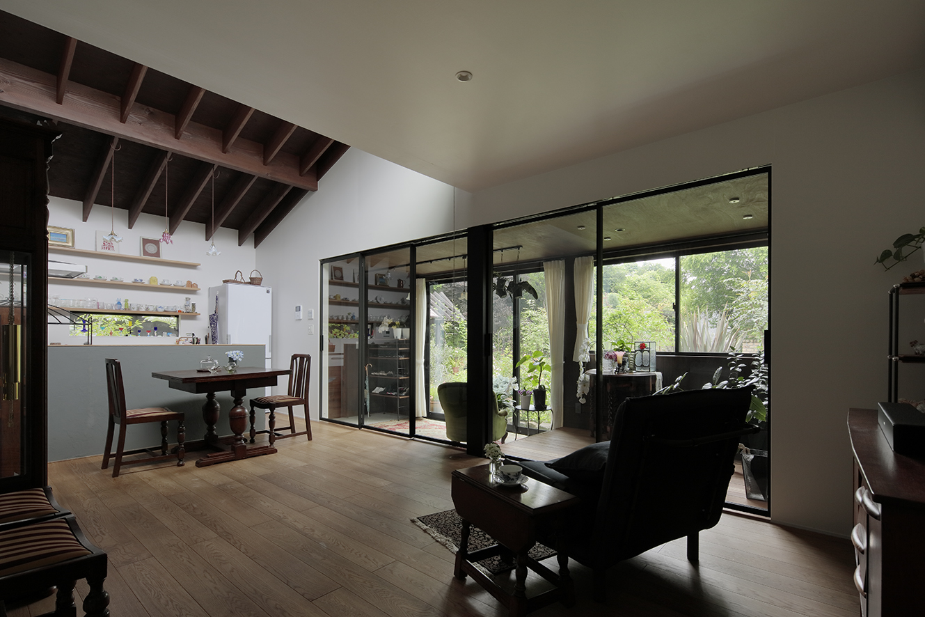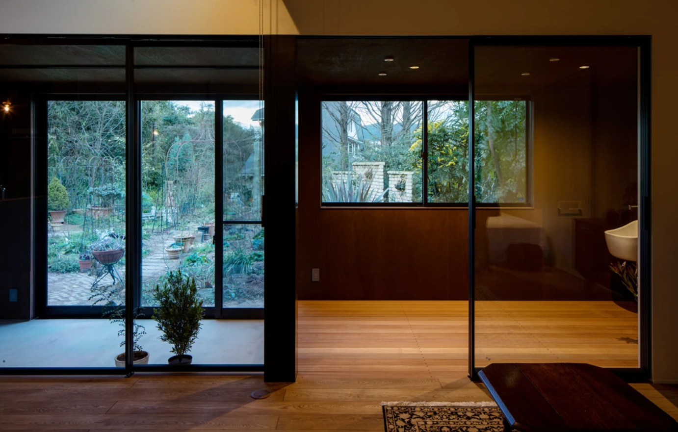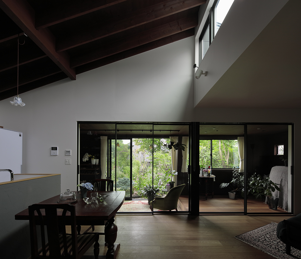 リビングと土間、土間と庭をつなぐ扉を全面ガラスの引き戸にすることで、リビングにいながらも庭全体を眺め、楽しむことができます。