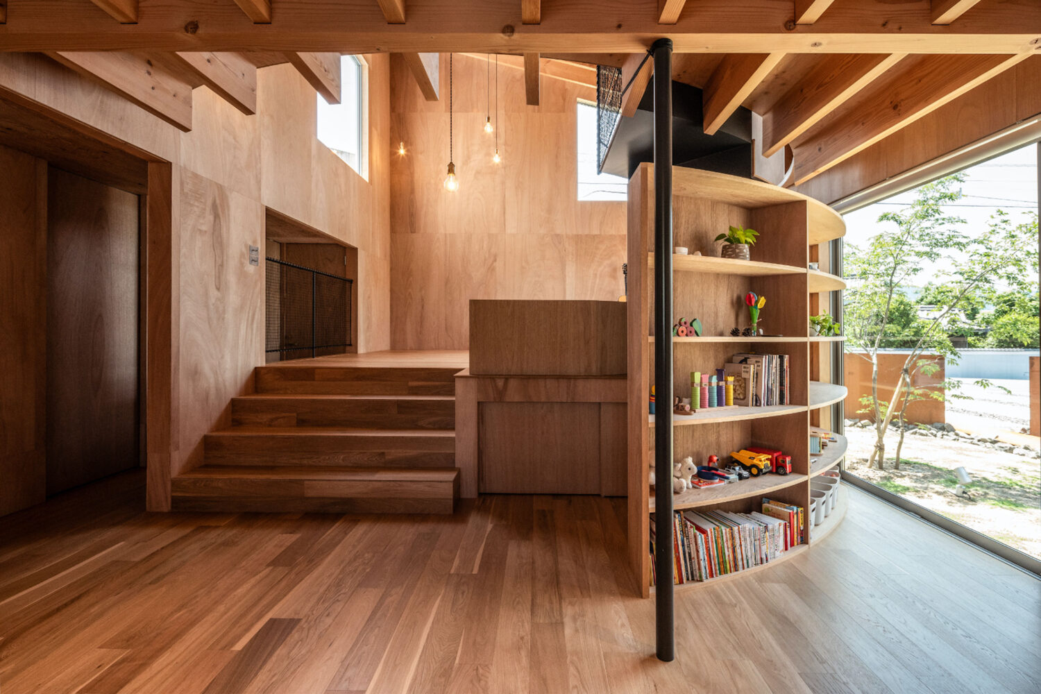 大きなテーマは、周囲の自然環境と調和し、田園風景や畦道が家の中にまで続くような設計。外に出れば広がる穏やかな風景が、家の内部にも溶け込むように配慮されています。リビングの書棚には、柔らかな曲線(アール)が取り入れられ、空間に自然な流れを生み出します。アールのデザインによって、住まいの中に新たな使い勝手や広がりが生まれ、家全体に柔らかな印象を与えています。