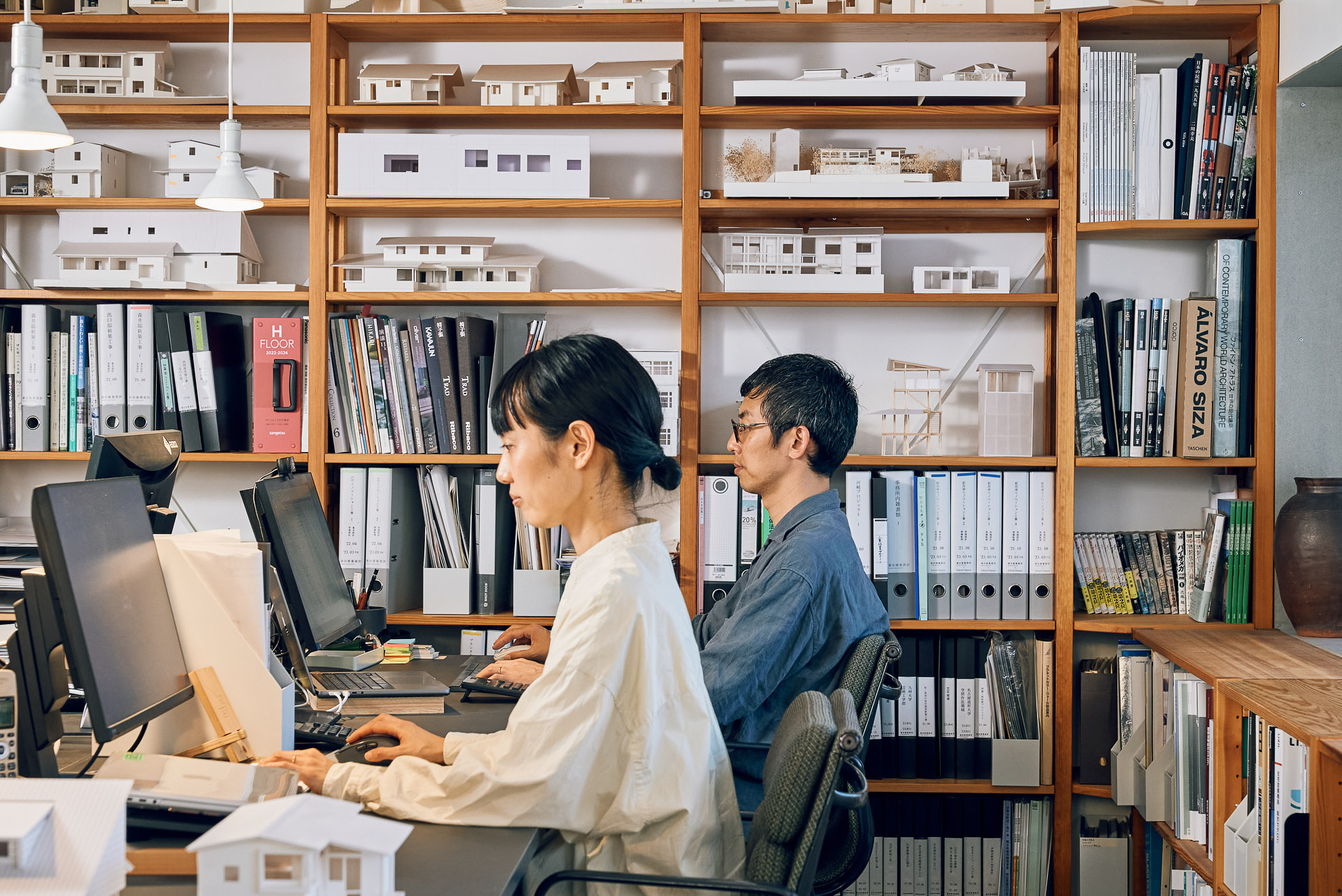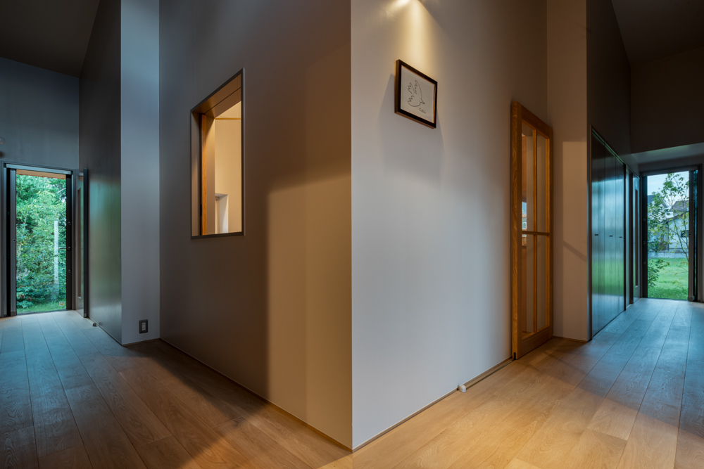 住まいの中心に据えられたのは、家族の時間を育むこぢんまりとしたLDK。その周囲に寝室や水まわりなどのプライベートな機能空間を配置し、L字型の廊下でやさしくつないでいます。廊下の天井は高く、空間の奥行きを感じさせ、対照的に個室は天井を抑えることで、落ち着いたリズムを演出。空間の「高さ」で、暮らしに抑揚をもたらしています。