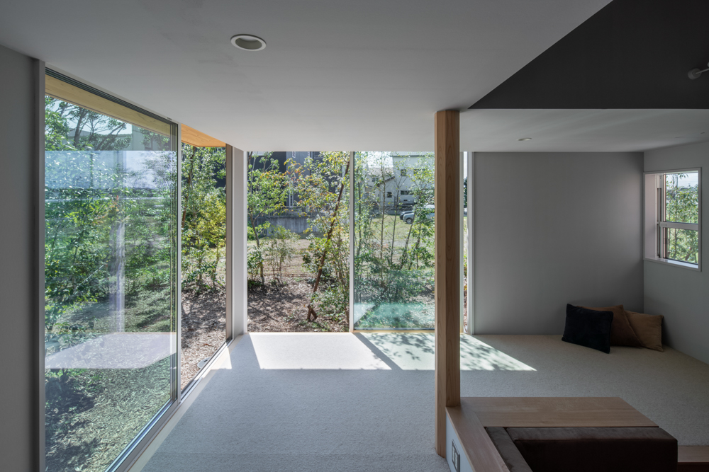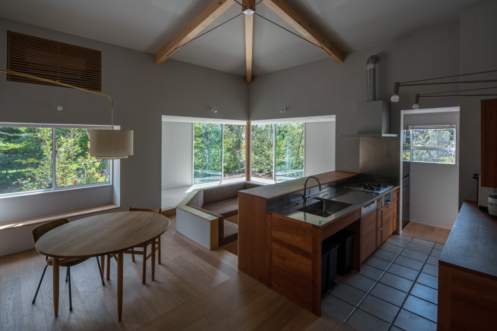LDKはあえて広すぎず、天井に設えた張弦梁が空間にアクセントと温もりを添えています。リビングの角のみに広縁を配置。この広縁は、ごろんと横になれるリラックス空間であり、自然の緑を望む特等席。外の景色とゆるやかにつながりつつ、室内のプライバシーも守ってくれます。