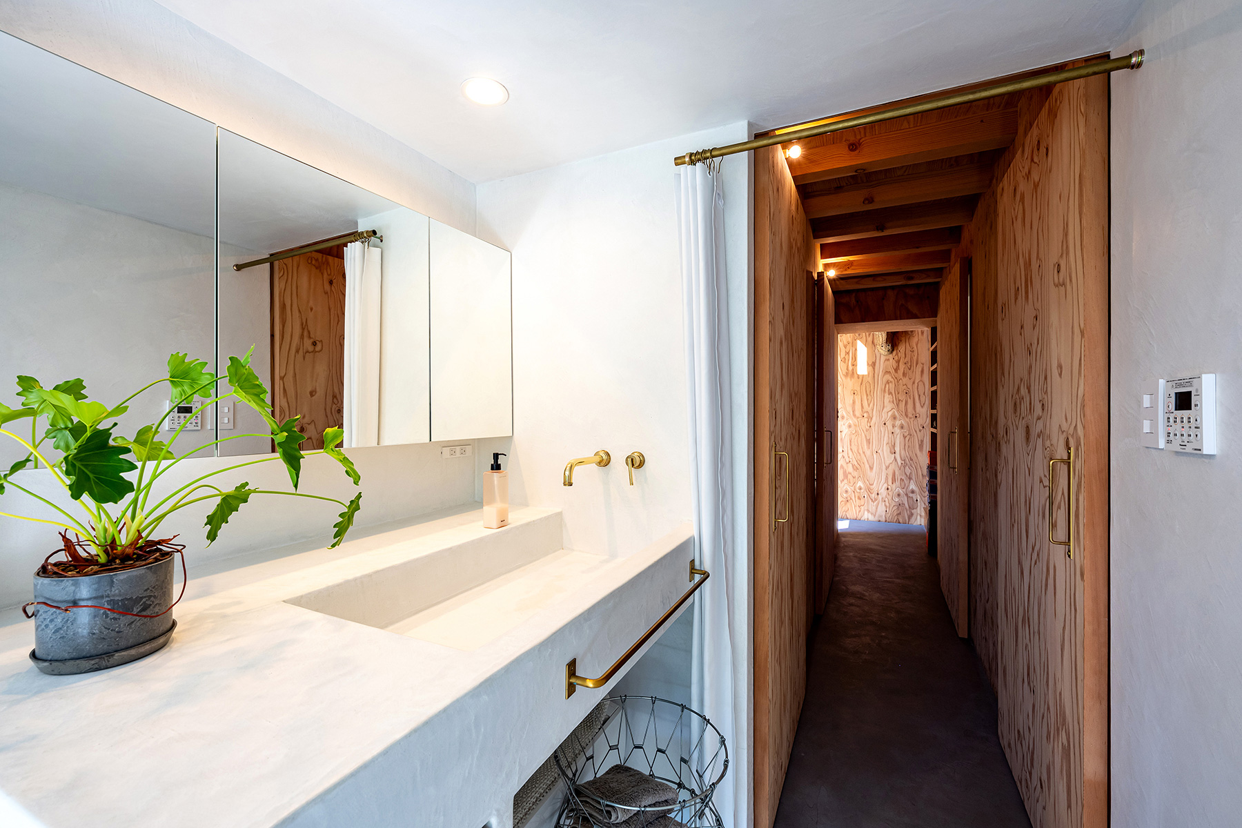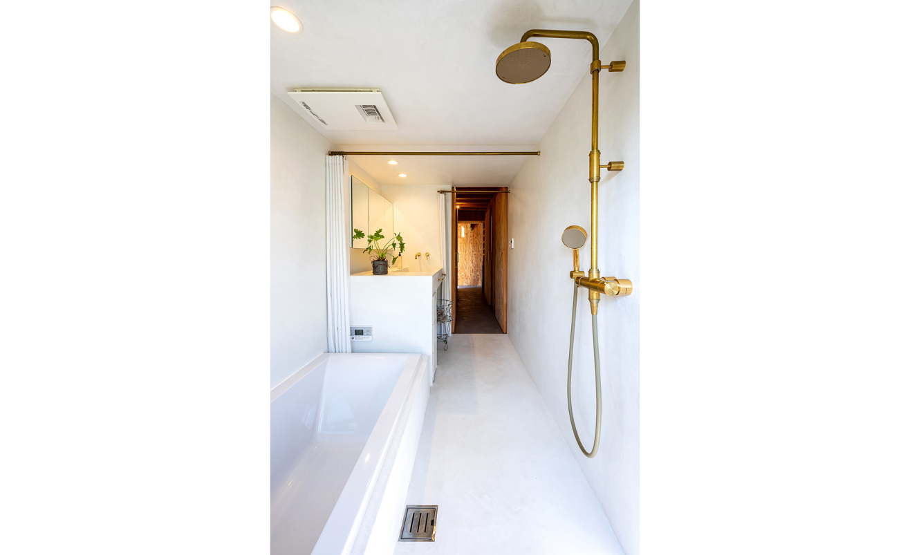 水回りからバス、シャワーまでを一直線にまとめた動線設計で、機能的でありながらも、心地よさを損なわないレイアウトに。