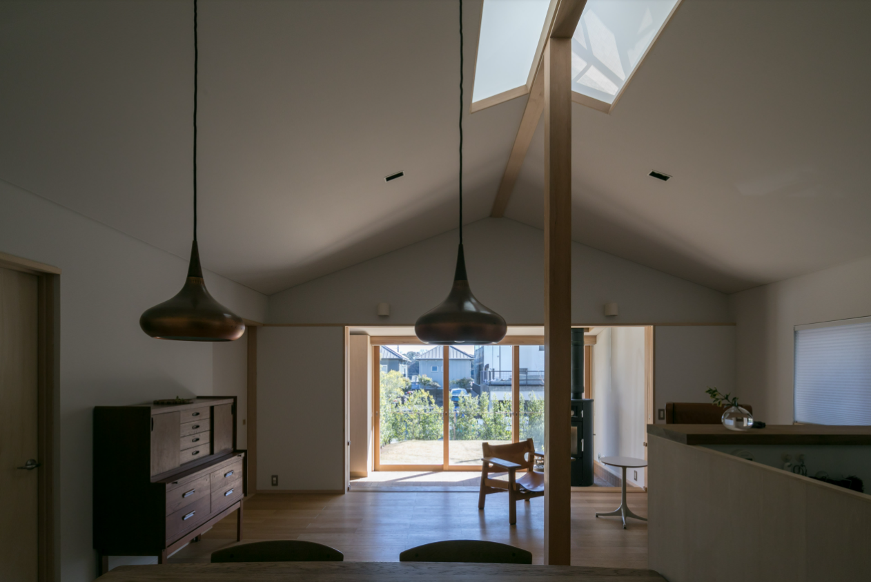 東向きの住まいでも家の奥までやさしい光が届くよう、家の中心にはトップライトを配置。朝には障子から漏れる光が心地よく、夜には内にこもる灯りが静かに包み込みます。