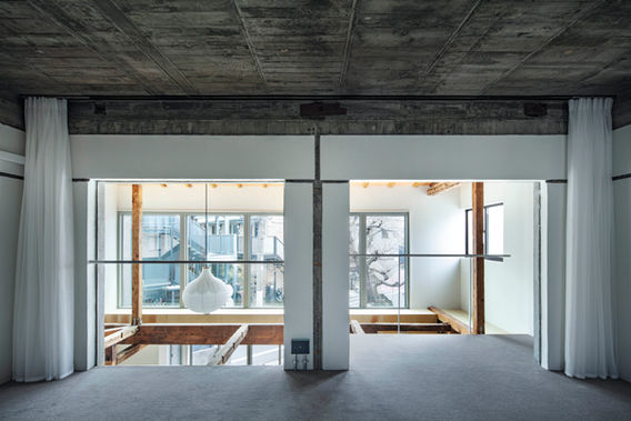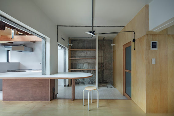 築70年のRC造長屋をリノベーションしたこの住まいは、団地と街が出会う場所――南東角の、人通りの多い通りに面しています。