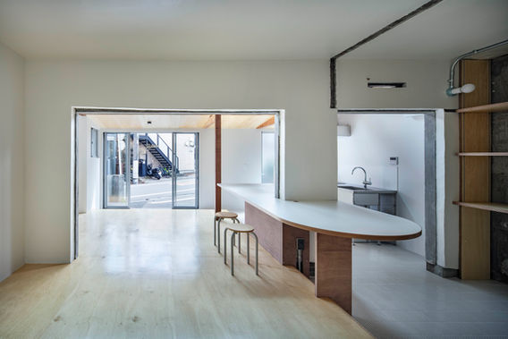 仕上げや間仕切りをそぎ落としたミニマルな空間には、光の揺らぎや温熱の違い、大きなテーブルなど、暮らしのシーンを自在に描ける余白が散りばめられています。さらに東側の減築で生まれた外構のゆとりや、窓越しに続く長屋のリズムが、団地にもう一度、やさしい奥行きを与えています。夜には2階の窓から灯りがこぼれ、街にそっと、あたたかな記憶を灯します。