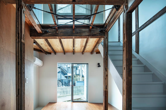 かつて庭だった南側は、住まい手の工夫と共に増改築が重ねられ、風景は少しずつ複雑に、空間は次第に閉ざされていきました。今回の改修では、その増築部分をあえて取り払い、吹き抜けのある明るく開かれた空間へと再構築。2階の大きな開口からやわらかな光が降り注ぎ、かつての庭の記憶が、光と空気の流れとしてよみがえります。