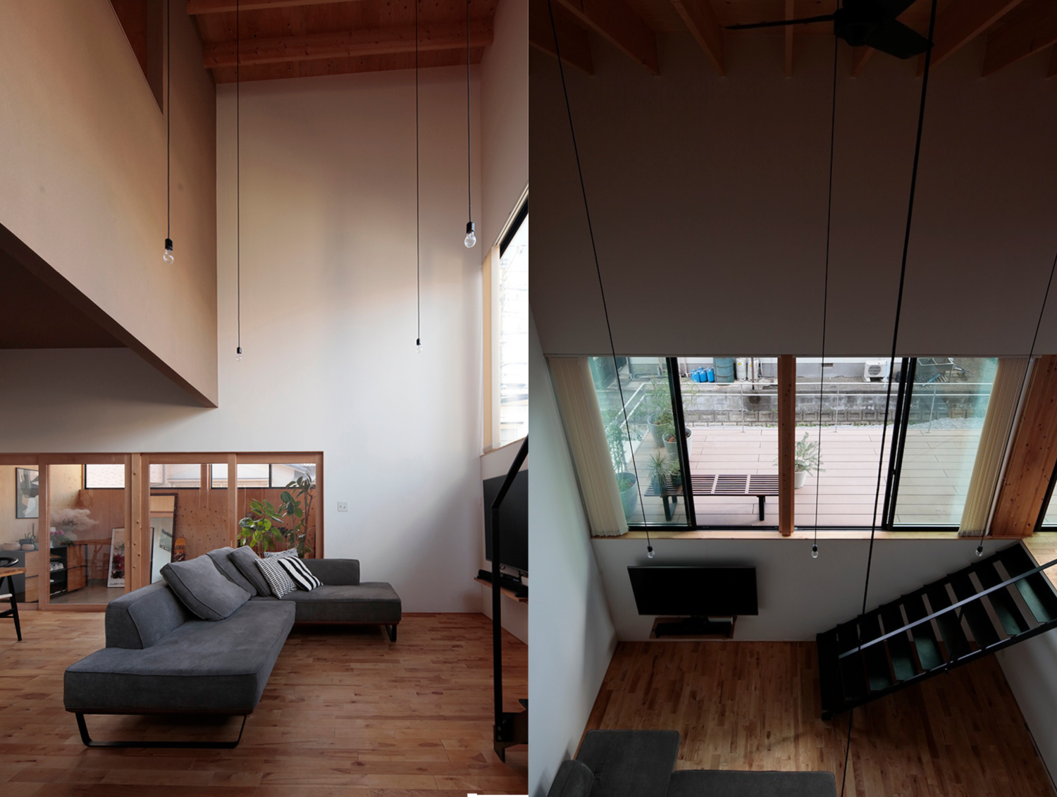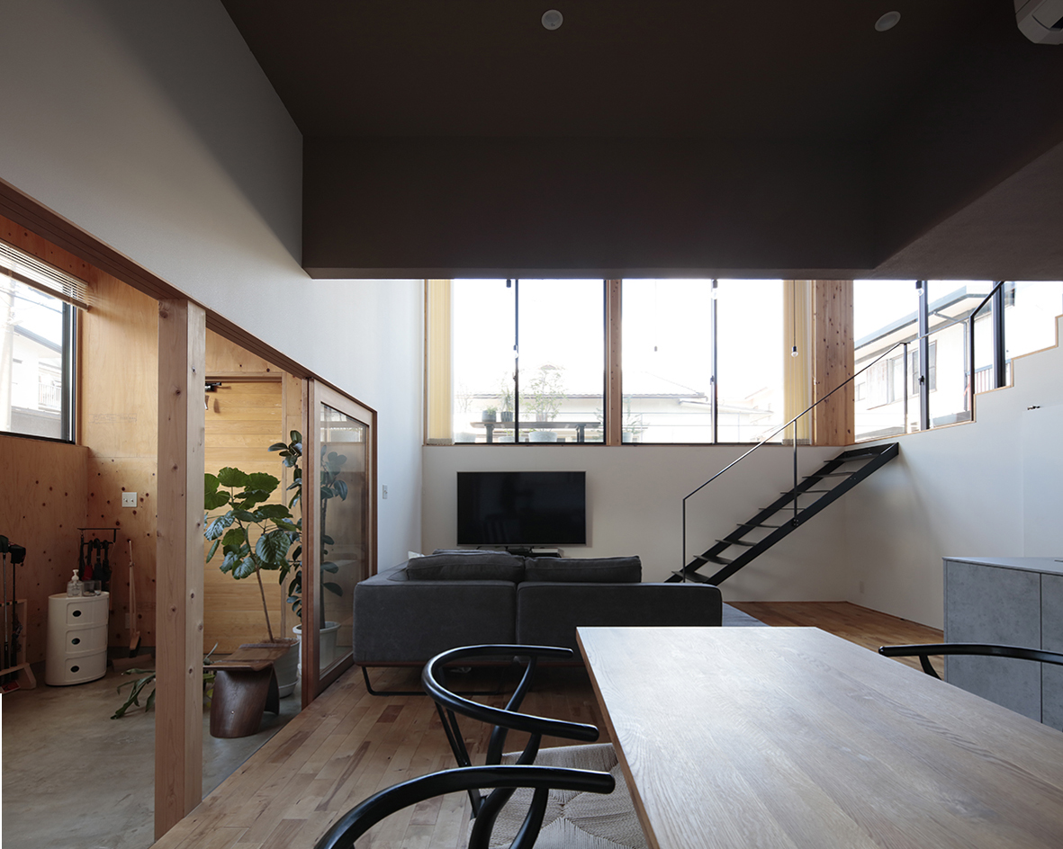 天井までの大きな窓を実現するために、1階、1.5階、2階の設計にすることで、リビングは吹き抜けに。1.5階部分のスタディースペースの窓からは、デッキを通じて1階外へもつながっています。