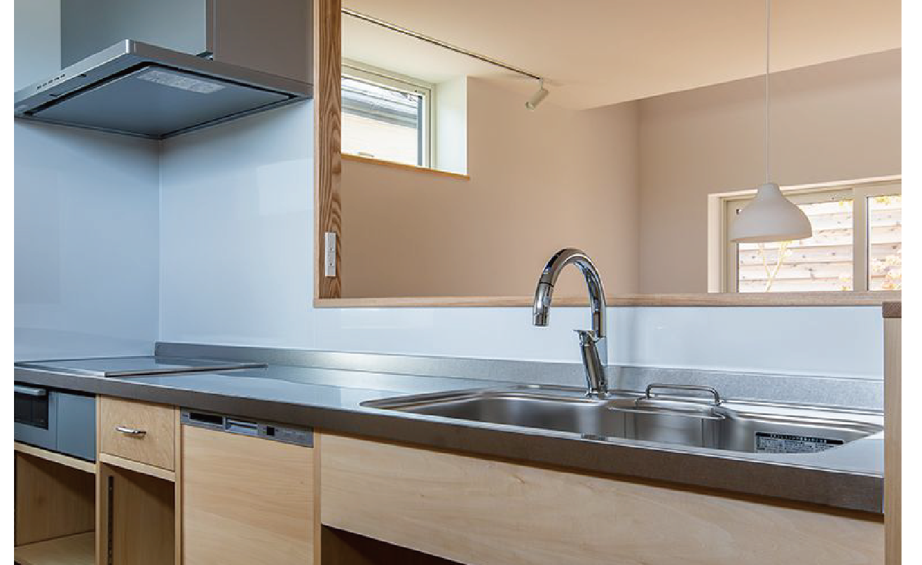 フロアの中心には階段を配し、その周りをぐるぐる回れる回遊動線をプランしました。キッチンからサニタリーへ直行できることで、生活動線も家事動線もスムーズに。階段下をトンネルのようにくぐれるようにしたことで、この動線を実現できました。