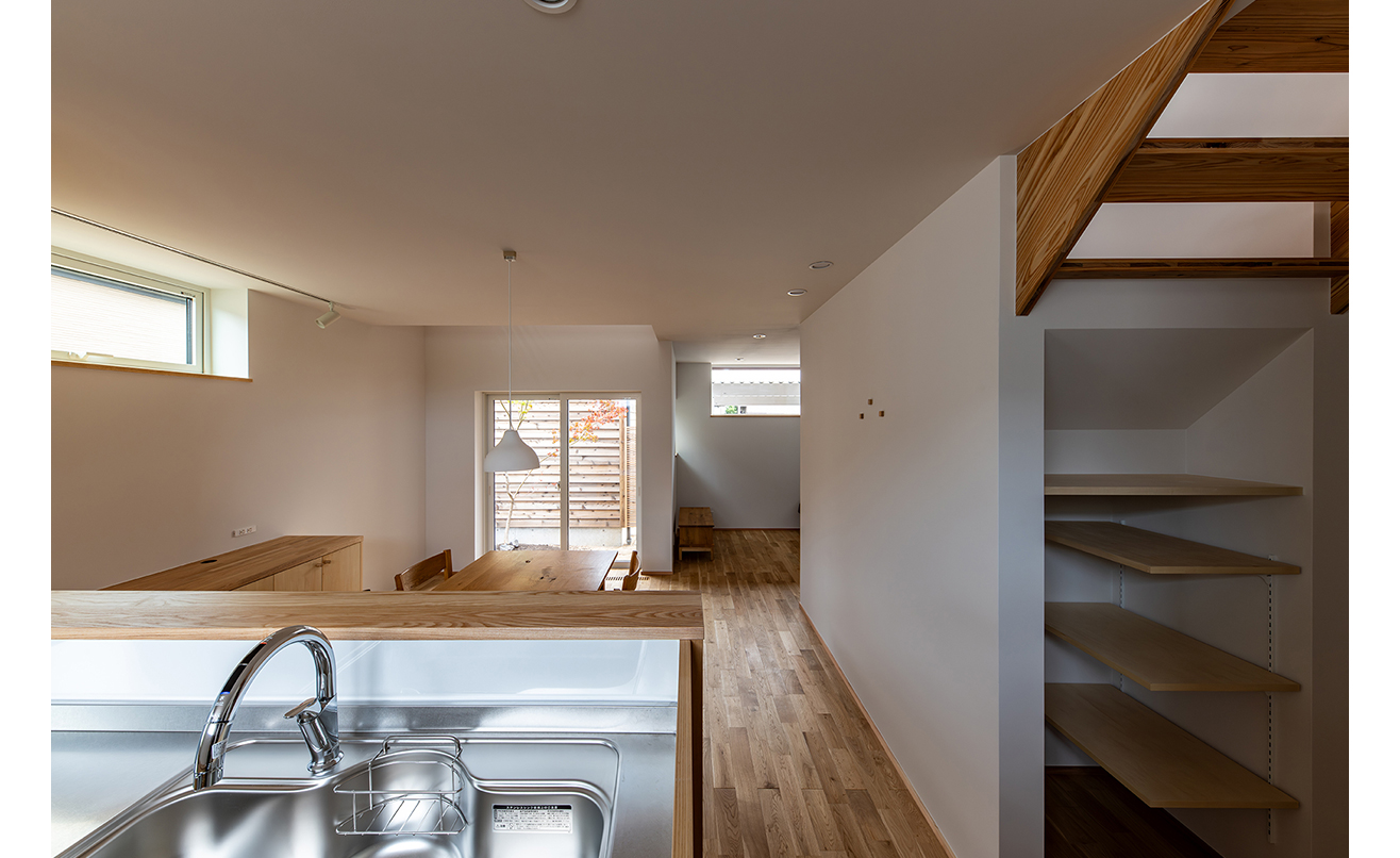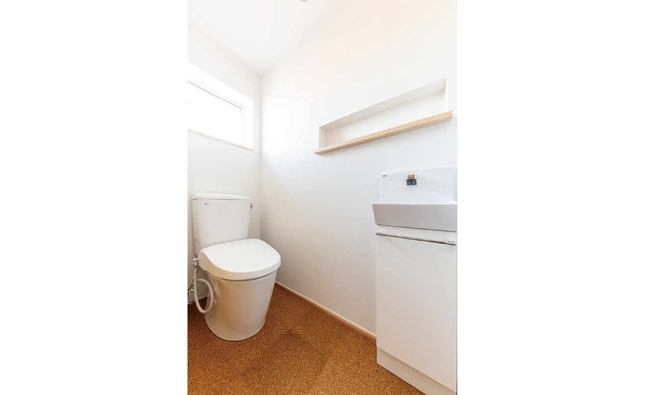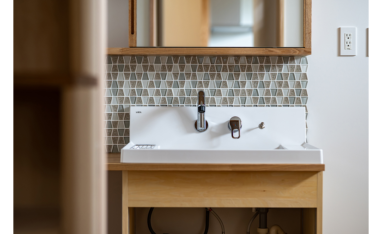 このお宅のトイレは、廊下からいったん洗面室を経由しなければ入れないように計画されています。あえて動線を長くしたのは、お施主さまからのリクエスト。もともとは廊下に面したトイレの入口を計画していましたが、「使用中の音が気にならないように、リビングからもっと距離を取りたい。できれば扉2枚を開け閉めしてから入れるようにしたい」と要望されたのです。