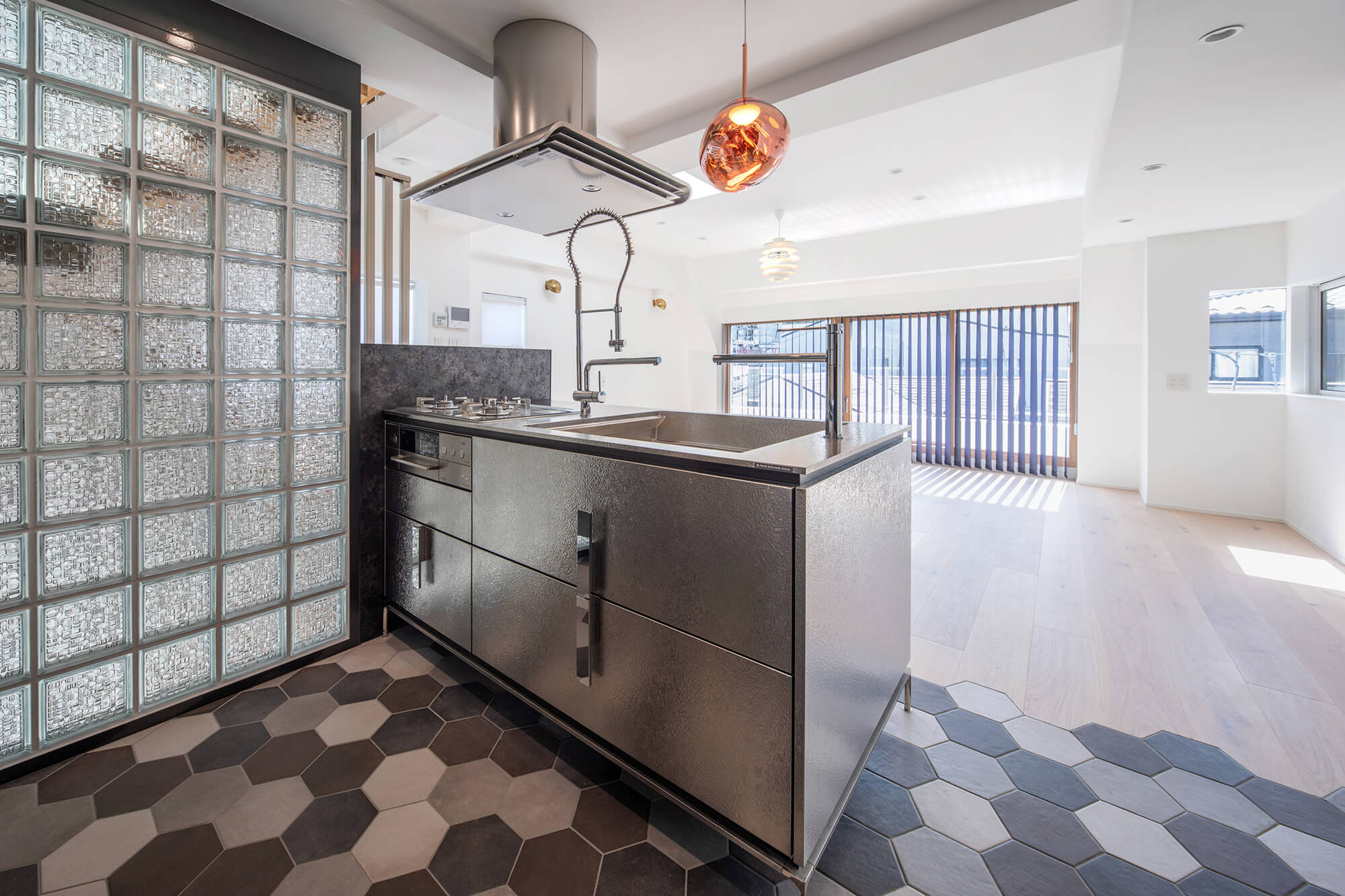 奥まったキッチン環境を活かしたことで、別世界に足を踏み入れたような楽しさを感じる、大人の遊び心が映えるキッチンとなりました。
