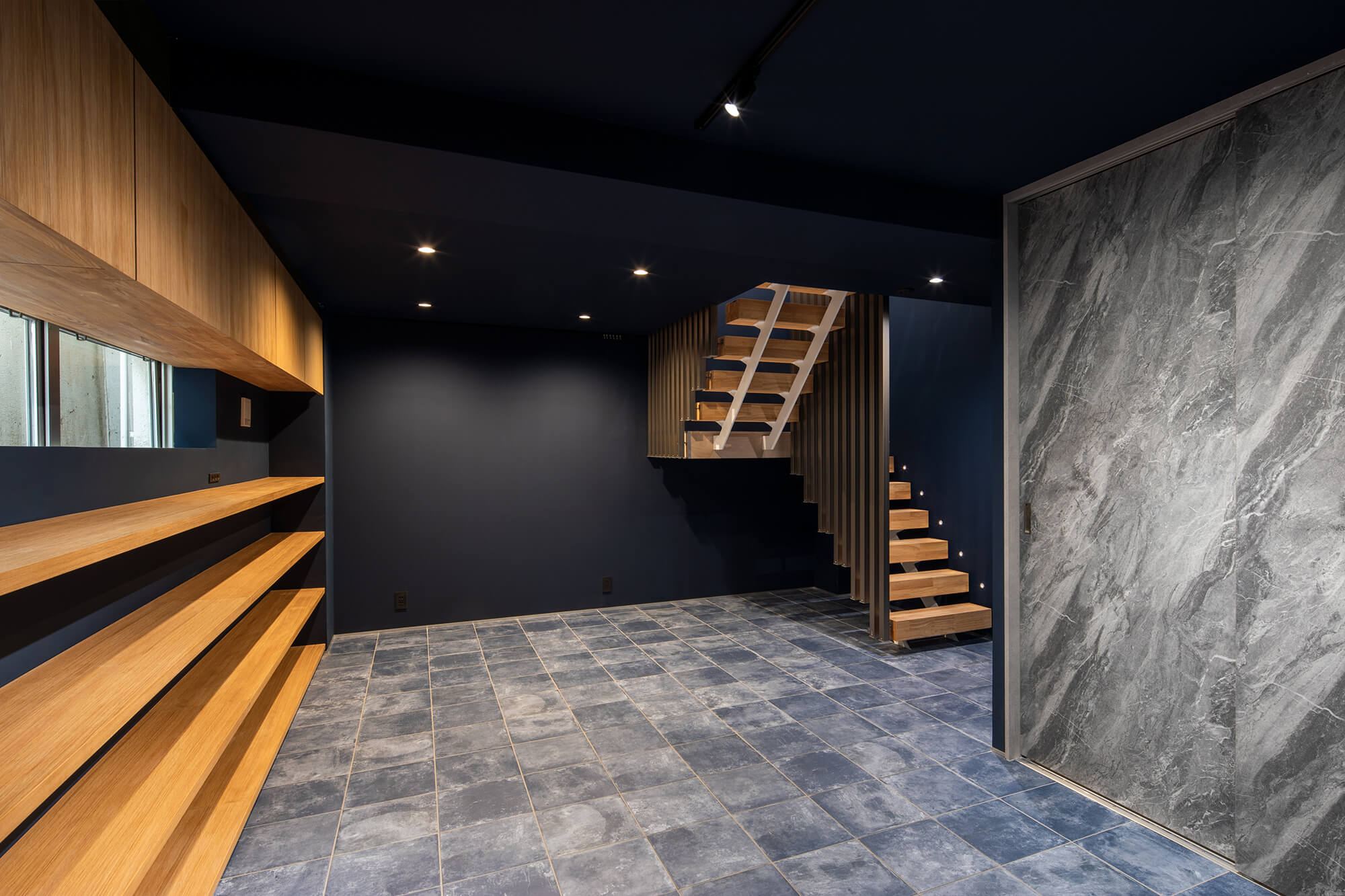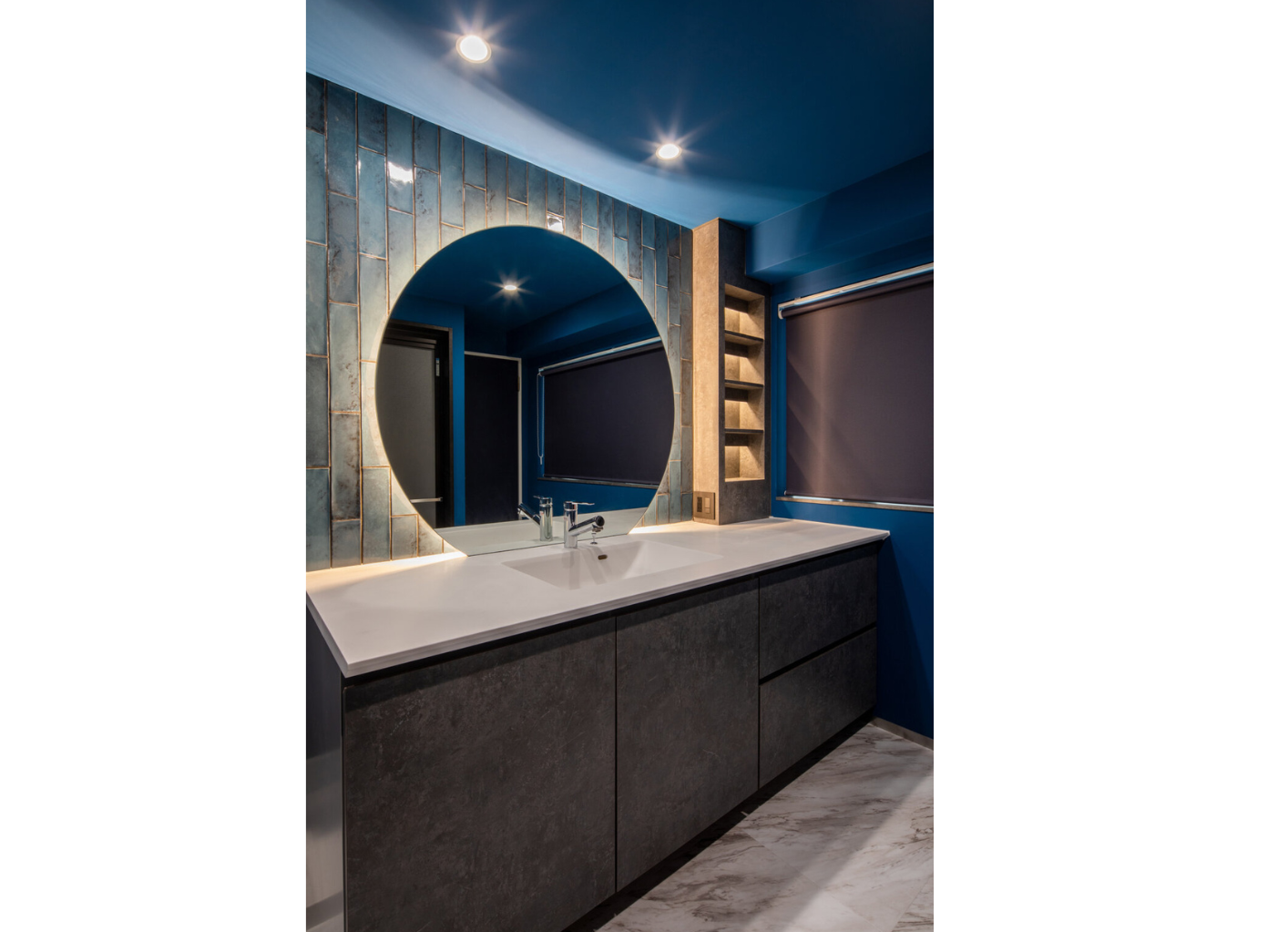 タイルは、お施主様のお気に入りのブルーを取り入れ、それに合わせて壁にもブルーを取り入れたことで、爽やかさの中に上質感を感じます。