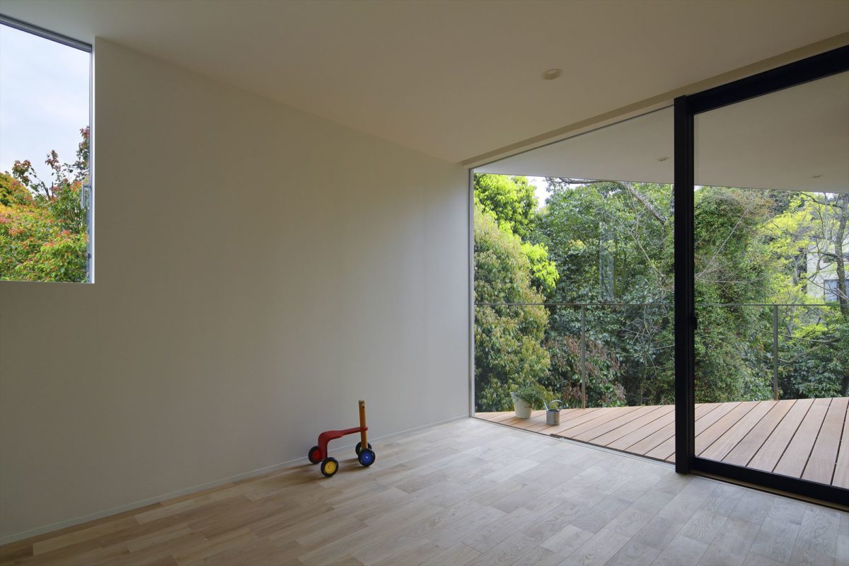 外からは閉じた印象ですが、LDKに入った瞬間、視界いっぱいに広がるのは緑のパノラマ。