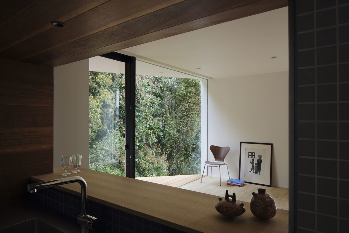 崖下の国有林がまるで一枚の絵のように室内に溶け込みます。サッシを排した枠なしの大開口窓や、取っ手のない木製引き戸など、視界を妨げない工夫が随所に。
