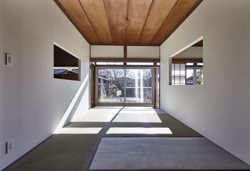 通常、窓といえば外部に向けて設けますが、この住まいでは廊下から畳の部屋、その奥のアトリエスペースへと視線が抜けるように窓を設けています。窓に生まれる遠近感を活かし、住まいの中に奥行きや距離感が感じられるよう、窓の大きさを少しずつ変えています。