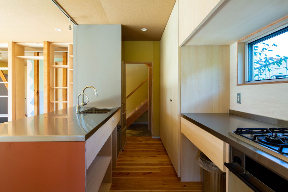 そんな悩みを抱える施主の方も多いです。そこで提案している工夫が、キッチンの天板部分(ステンレストップ)のみをオーダーメイドで購入し、下の収納部分は大工さんに造ってもらうというものです。これによりコストダウンだけでなく、サイズや高さなど、使う人の希望に沿った使い勝手の良い一点物のキッチンを創ることができます。