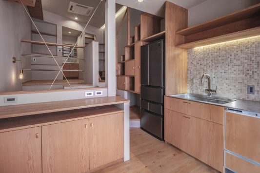 ワンルームに近い構成で、間口がわずか3メートルという限られた幅の中でも、奥行きや縦方向の視線を遮らないようにすることで、実際の面積以上の広がりが感じられます。また、スキップフロアやロフトによって上下方向にも視線が抜けるようにデザインしたことで、2階のリビングからキッチン、3階のロフトまで目線が自然に伸びていきます。