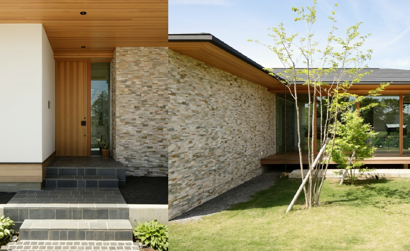 奥行きのある玄関には、やわらかな太陽光が取り込めるガラス窓や植栽できるスペースが設けられており、自然な立体感が美しさを引き立てています。