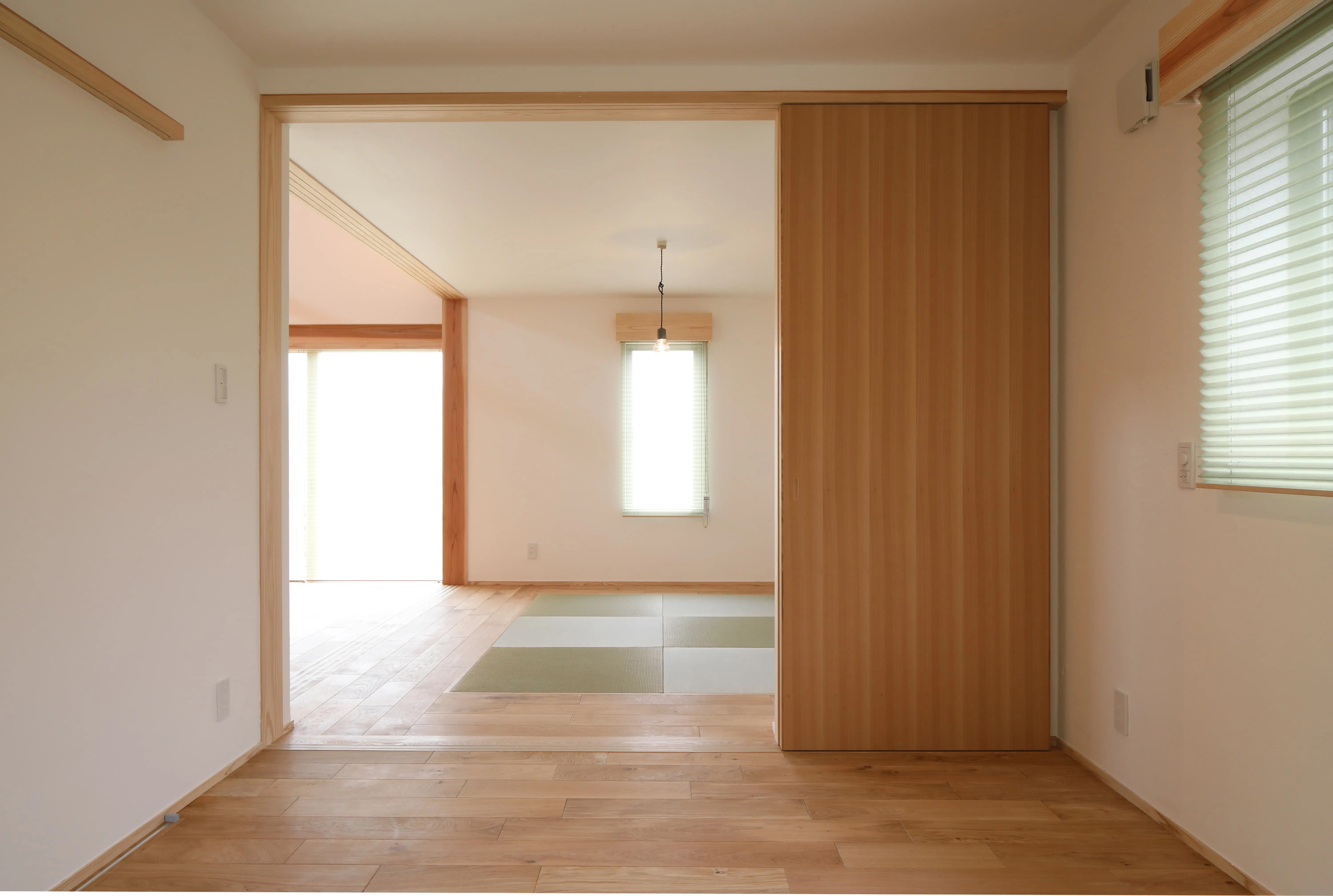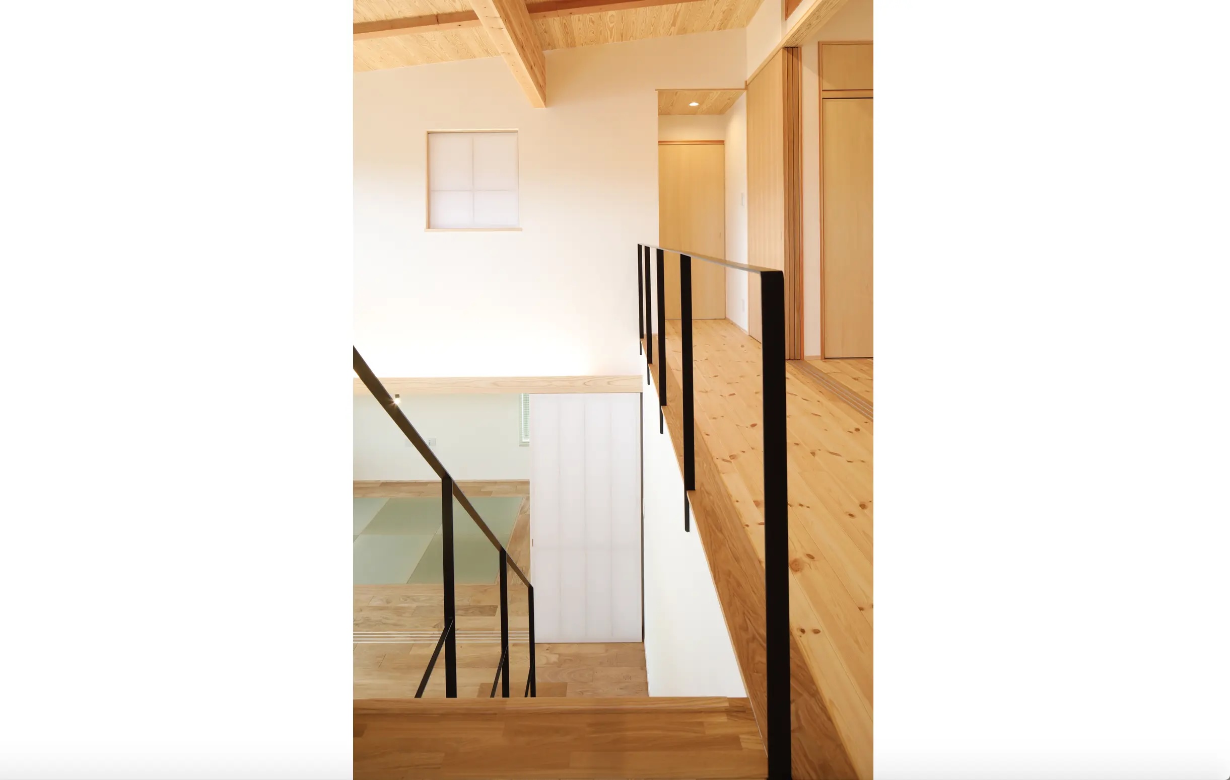 2階には4つの個室を配置。リビングを吹き抜けとし、ここを通って2階にアクセスする動線とすることで、家族間の自然なコミュニケーションが生まれます。個室の建具には大きな障子を採用。断熱性を高めるために二重貼りとし、開閉によって空間を緩やかにつなげる自由度も持たせています。