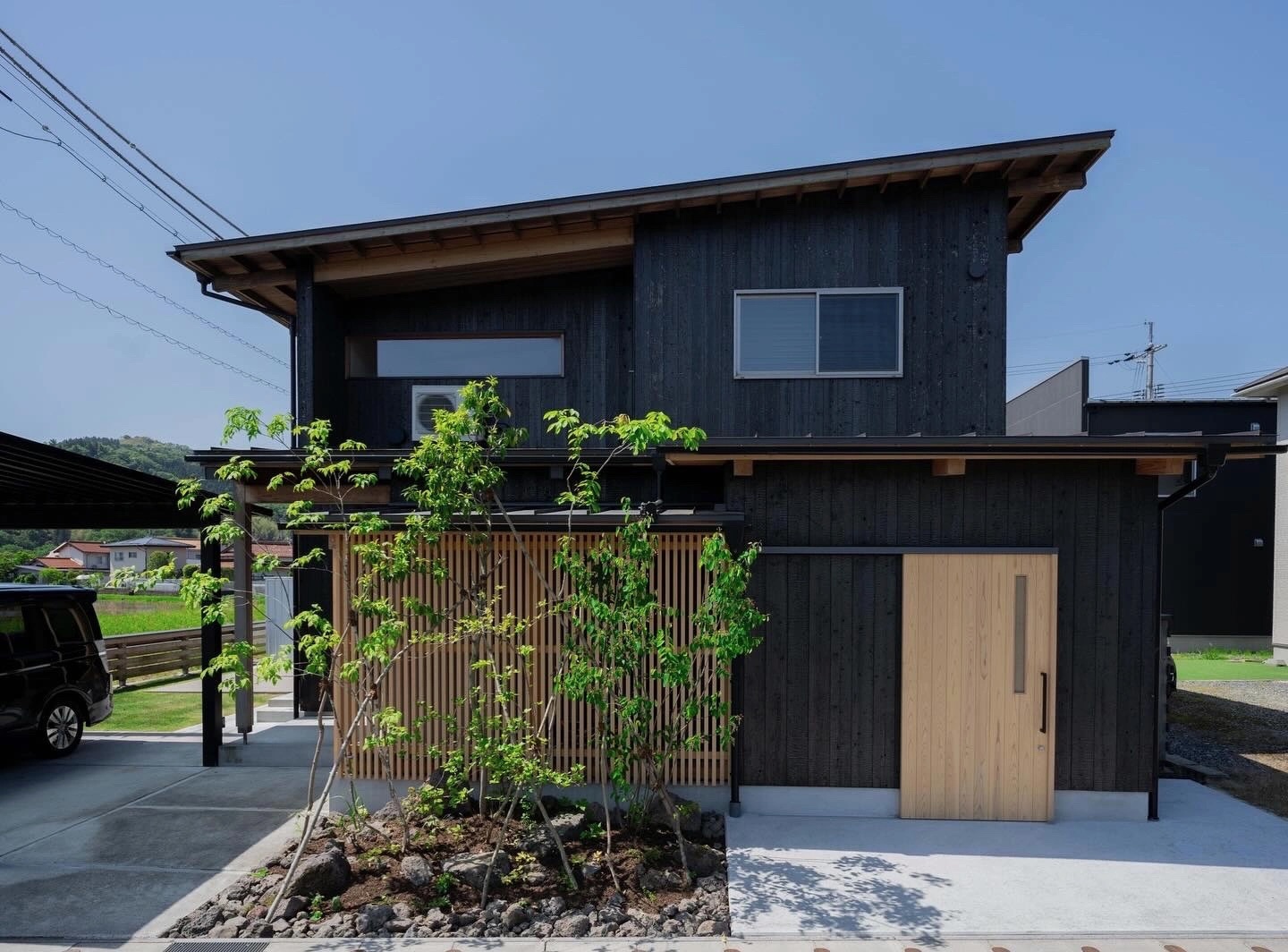 外観は焼杉で仕上げ、周囲の田園風景に溶け込むようデザイン。ご主人の「なるべく自然素材を使いたい」というご要望から、1階はオーク、2階はヒノキの床材を選定しました。
