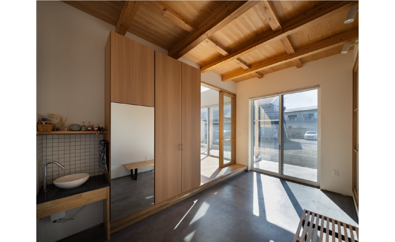 家の内と外をゆるやかにつなぐこの空間は、農村地域の名残りがある豊かな風土と、ご友人を招いてBBQを楽しむようなアウトドアなライフスタイルに呼応しています。