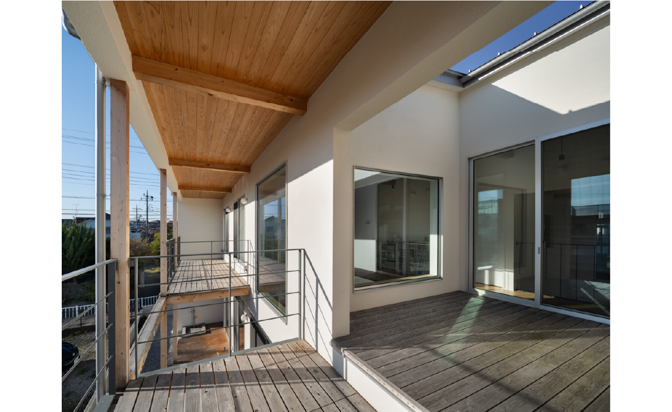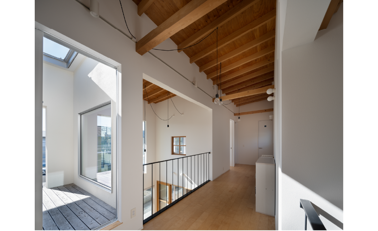 通り土間・吹き抜け・バルコニーの「3つの間」を立体的に繋いだ空間に、光と風がめぐり、家族の気配がふわりと通り抜けます。