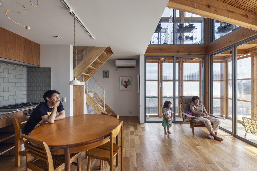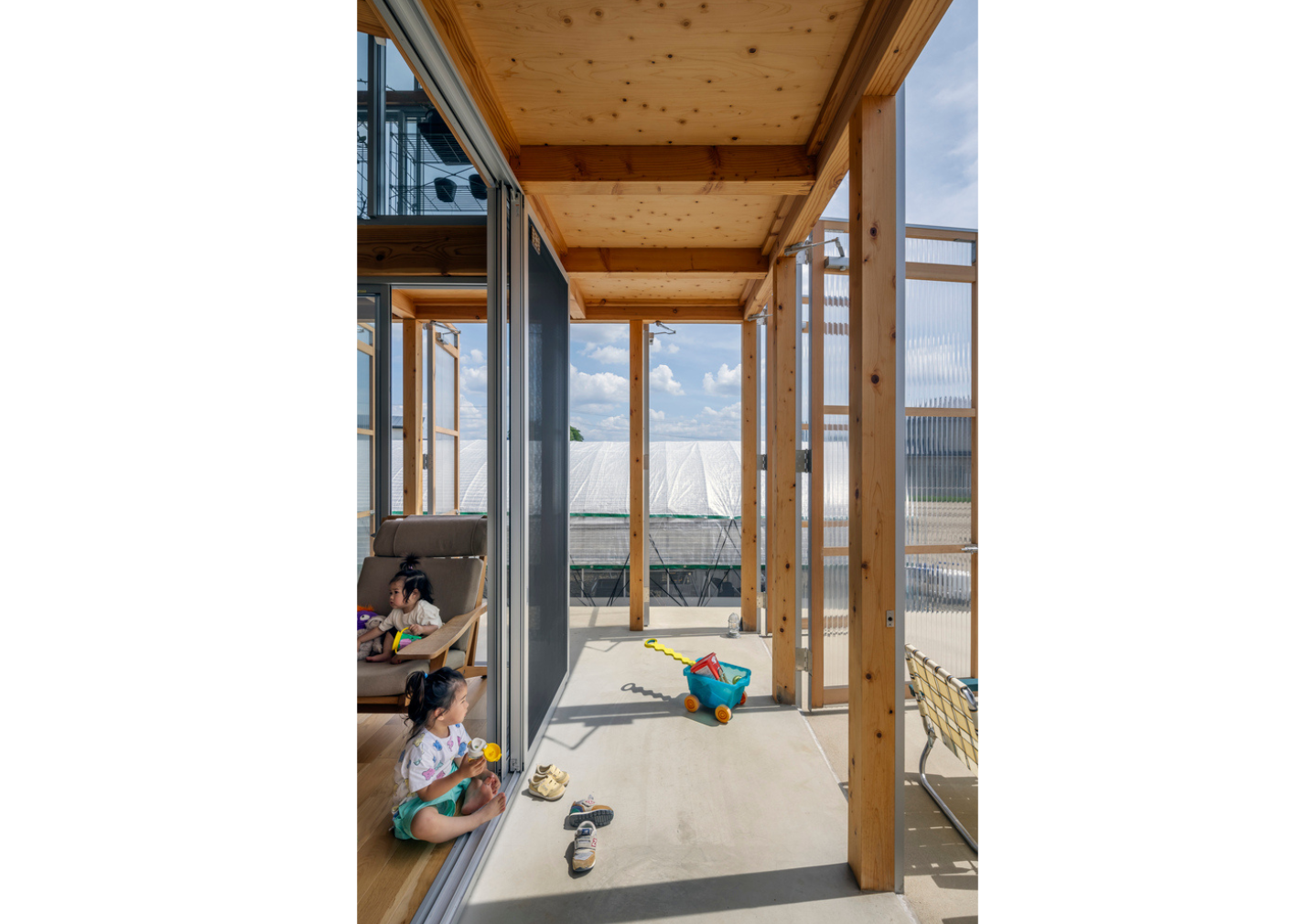 この土間空間に設けたポリカーボネートの扉は、すべて開けると屋外のように。閉めると屋内の一部となり自由に調整できます。さらにポリカーボネートのおかげでカーテンなしで快適に暮らせます。