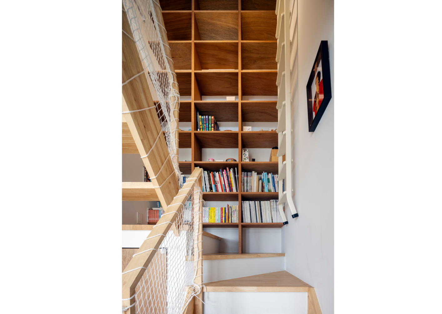 1階リビングと2階植物スペースをつなぐ階段には、読書が好きな奥様のために大きな本棚を設置。ご主人が植物の手入れをしている横で、奥様が本を読んだり、お子さんが遊んだりと、近くにいながらも思い思いの時間を大切にできます。