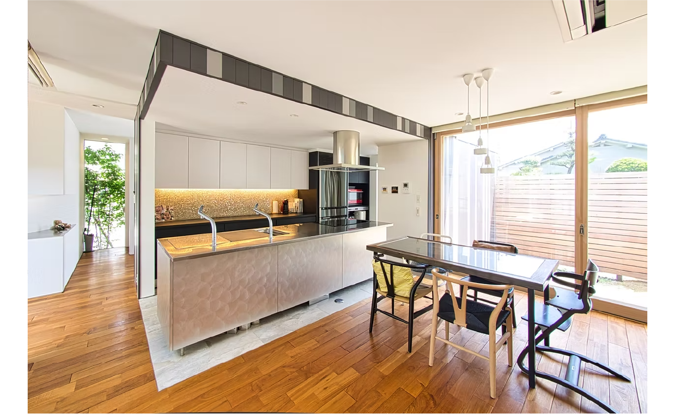 中庭と外庭をつなぐ動線の途中にあり、料理をする手元には、自然の光と空気、家族の気配がゆるやかに流れ込みます。外に開かれ、内に守られるようなその場所は、お母さんにとっての“自分の居場所”としても静かに機能しています。