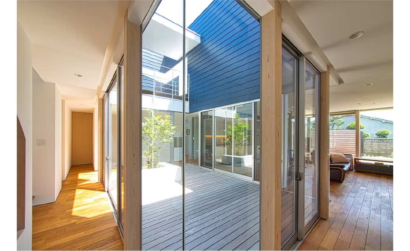 プライバシーを確保するため、外部はしっかりと閉じながら、内部には敷地の広さを活かして、開放感のある全面ガラスの中庭を計画。