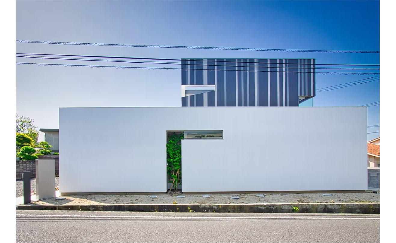 愛媛県松山市の密集した住宅地に佇む、全面ガラス張りの中庭をもつ住宅。