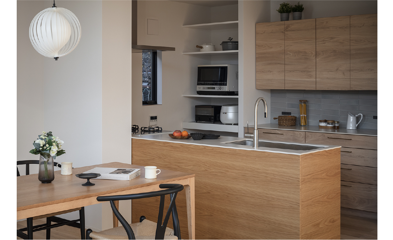 また、キッチンは子どもと一緒に料理をしたいという思いに応えるオープンな設計に。お施主さんの希望で冷蔵庫や電子レンジ、パントリーなどの家電はすっきりと隠されており、生活感をそっと包み込みながら親子の時間が育まれるあたたかな場所となっています。