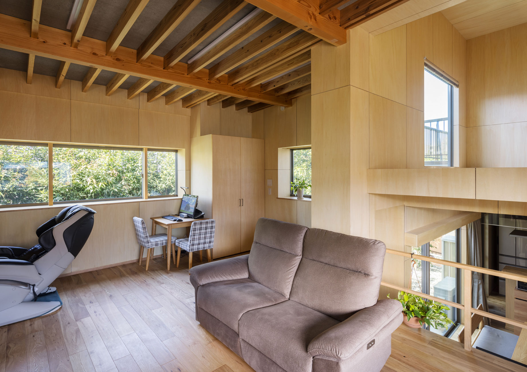 壁には猫による傷にも配慮し、9mmの集成材であるシナ合板という堅い素材を採用。玄関からリビング・ダイニングにかけて同素材で統一し、床材には無垢の楢材を採用したことで、更に明るくやさしい印象を与えます。