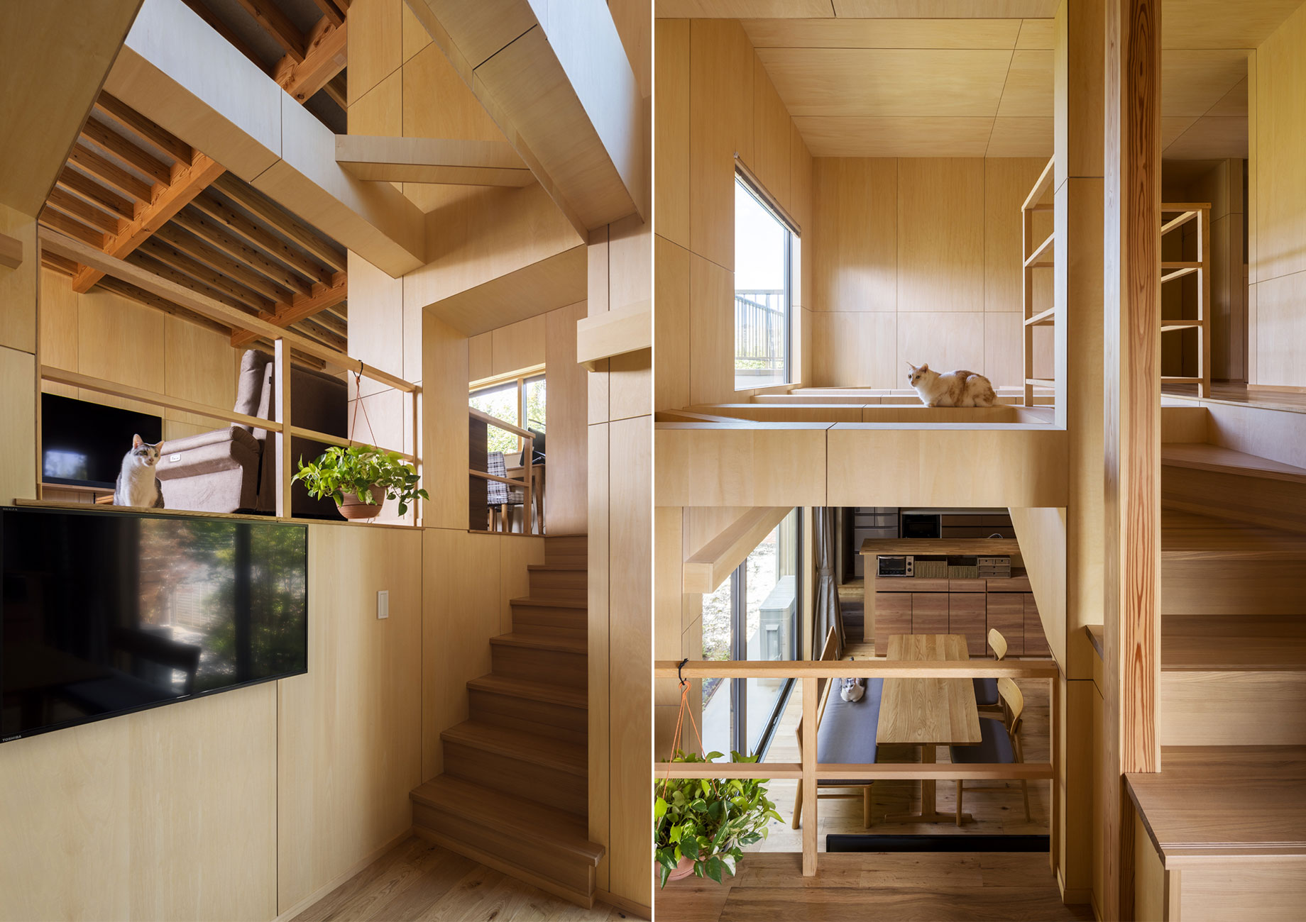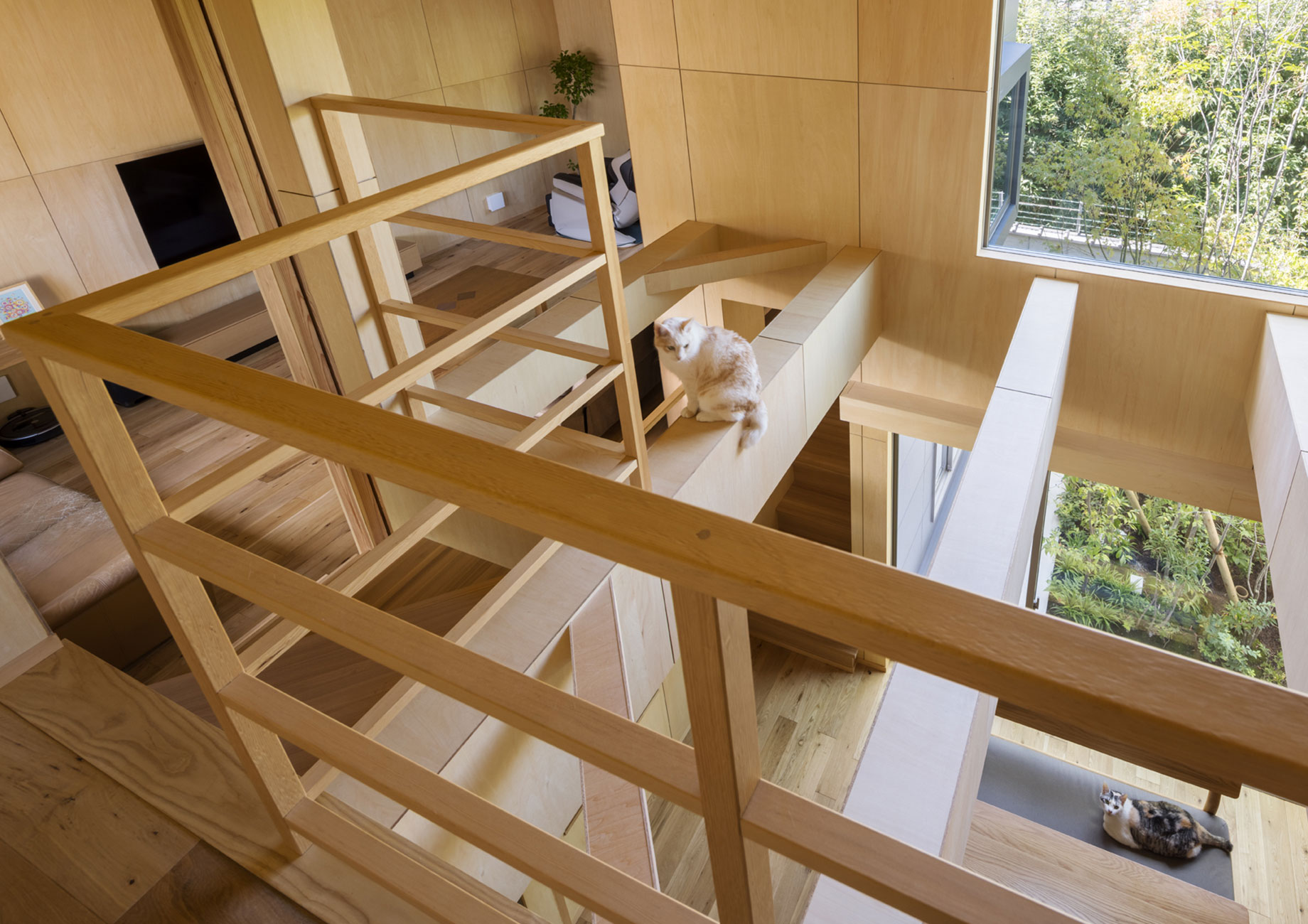 以前の住まいでは閉塞感があったことから、リビングへとつながる壁やダイニングの天井を取り払い、吹き抜けを設け、梁を現しにしました。その梁を囲むように設けた構造体がキャットウォークとなり、猫たちの居場所になっています。