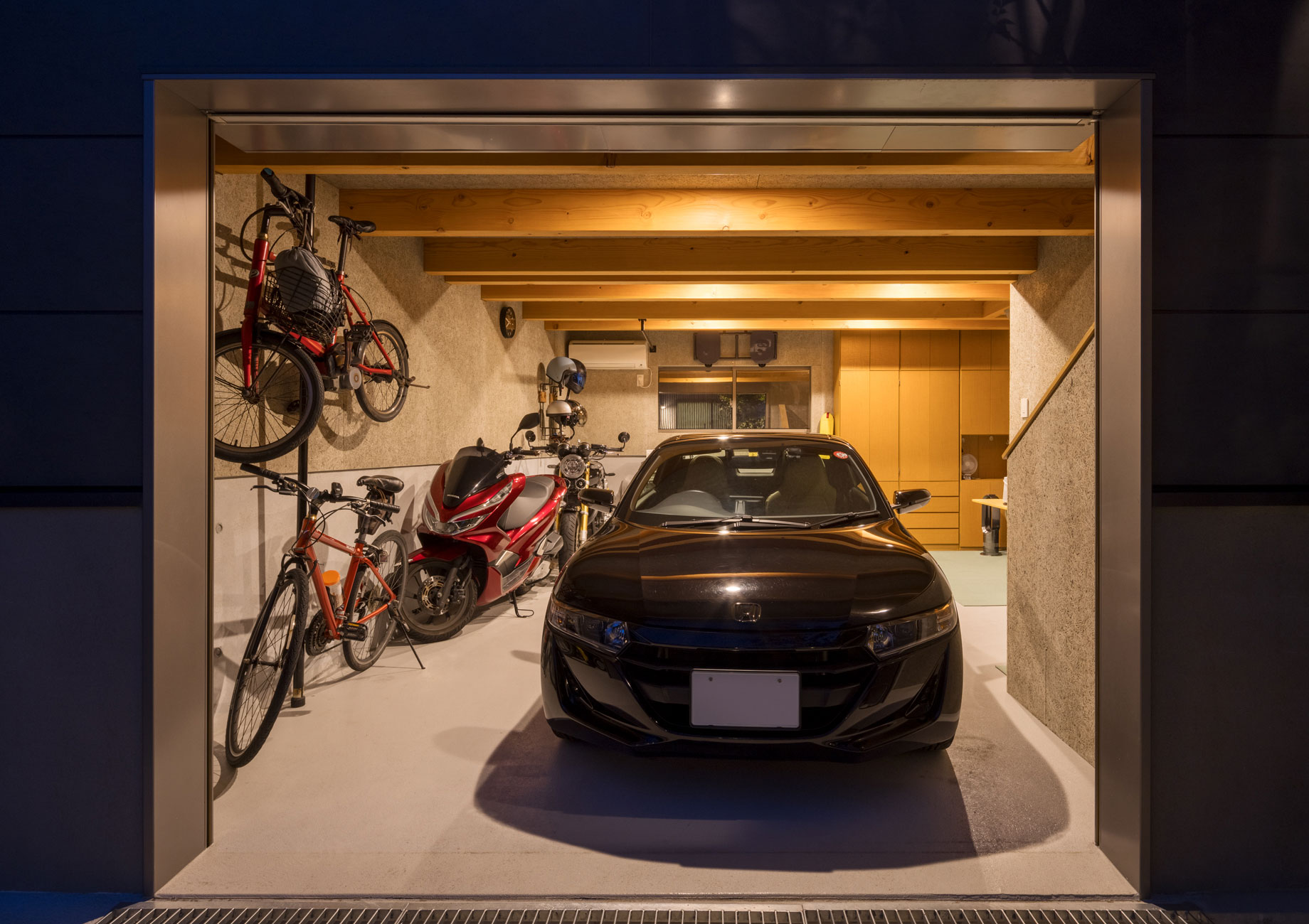 インナーガレージは、ご主人の趣味のための特別な空間です。そこからリビングへは、外を経由せずに直接アクセス可能。趣味空間と生活空間が、スキップフロアでつながります。